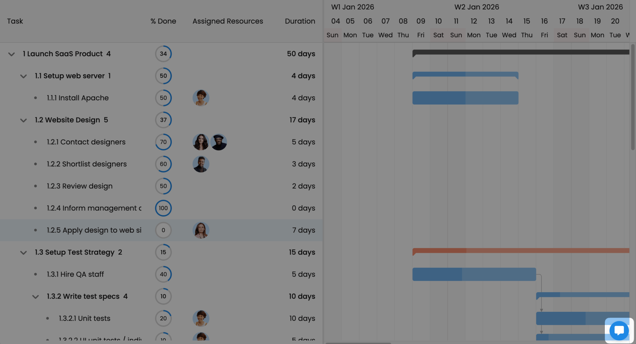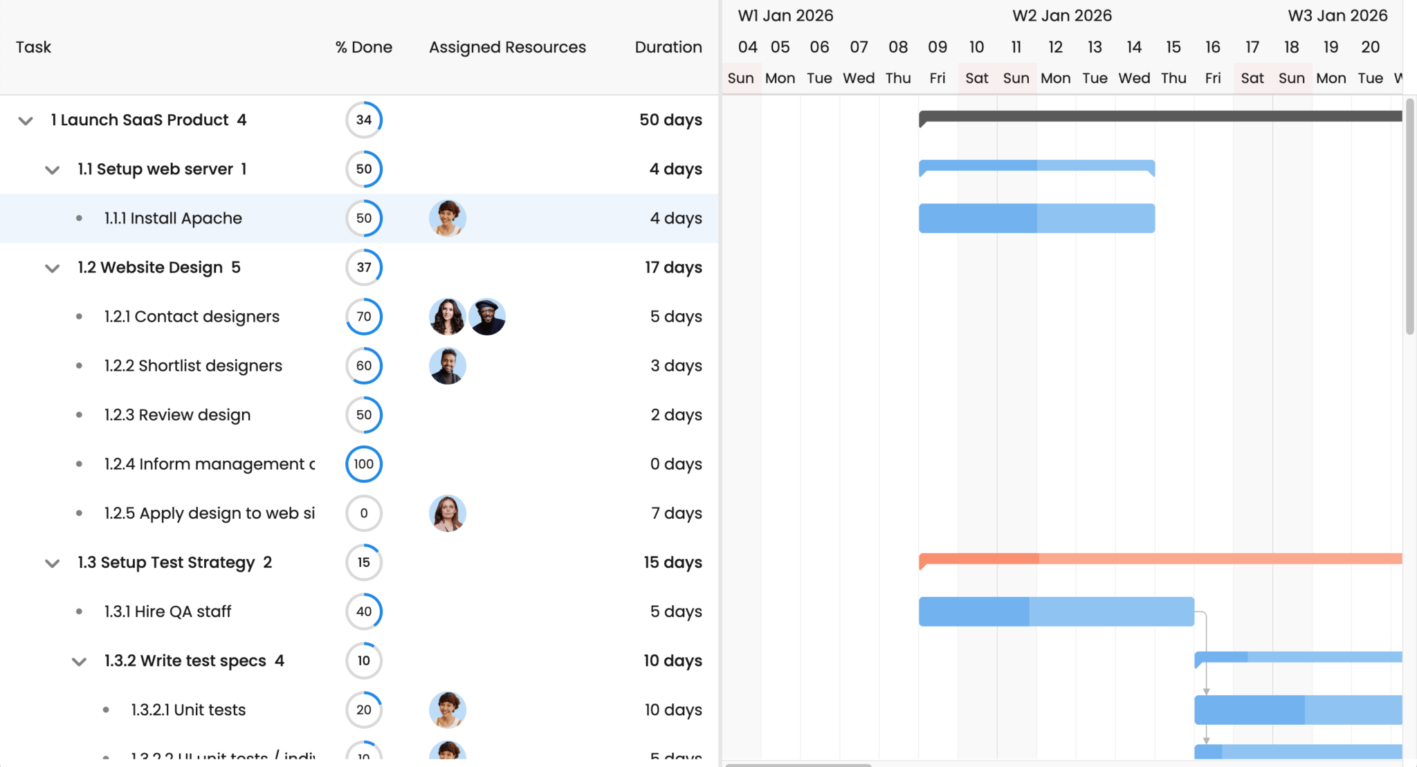 The renderer functions customize how data appears in each column. The columns display the task name, percentage complete (as a circle), assigned resources (with avatars), and duration: