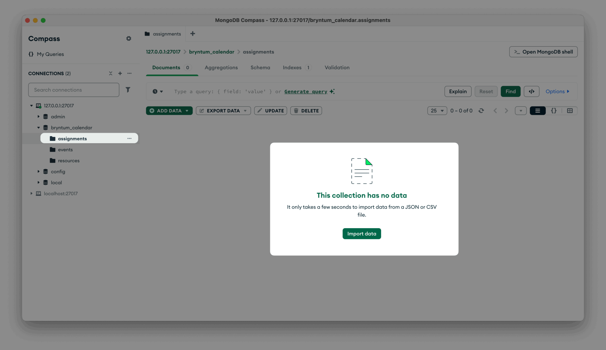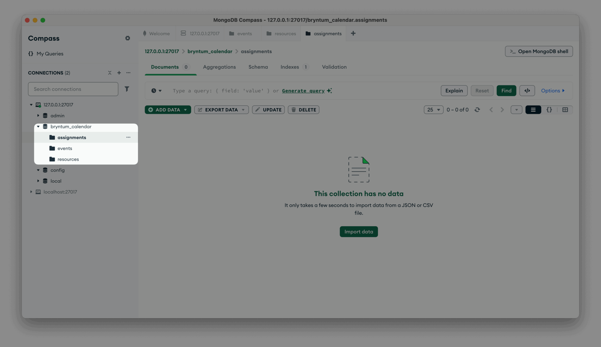 Now, we need to create a database for the Bryntum Calendar and make collections for the Bryntum Calendar stores.