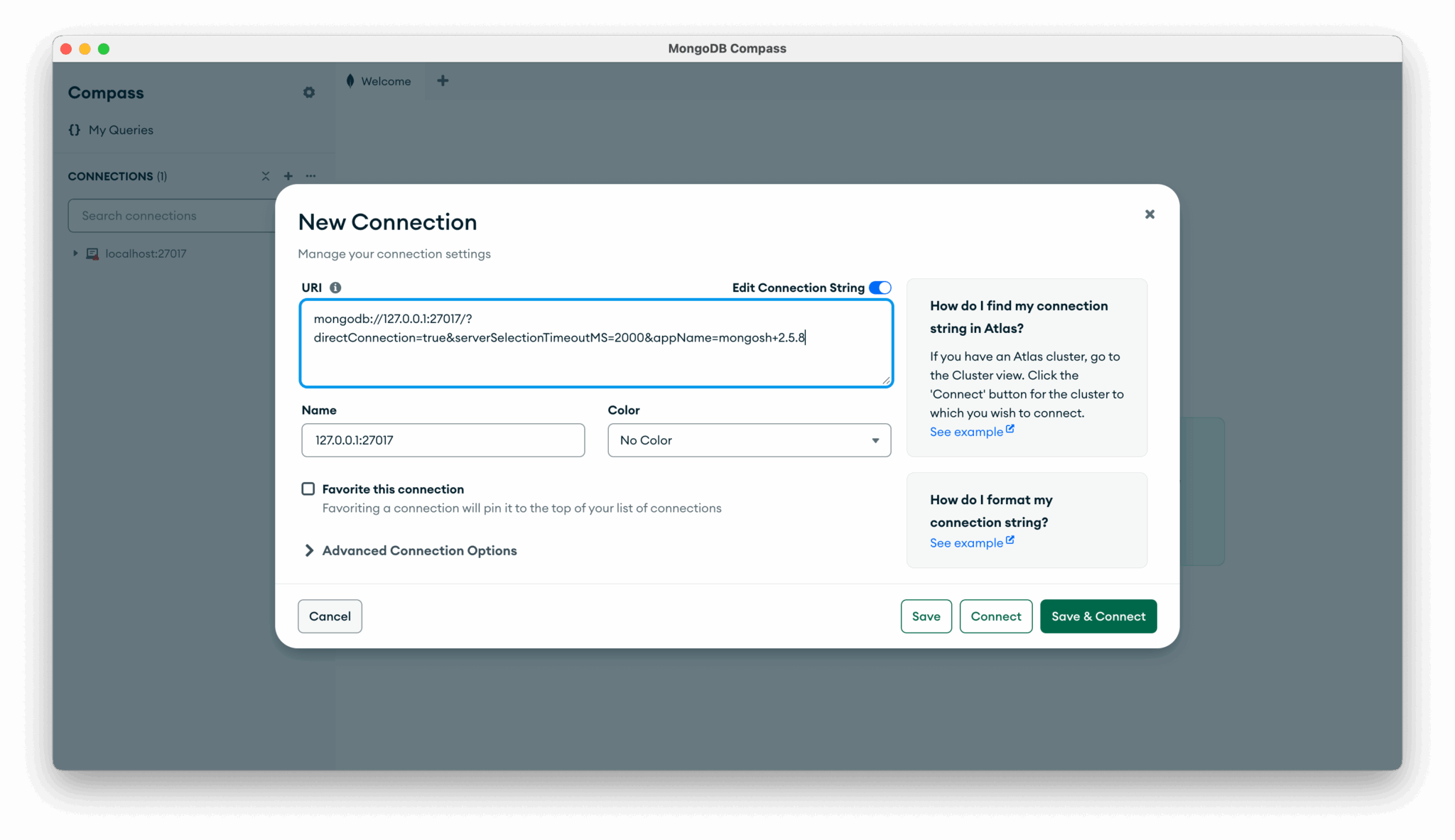 In the New Connection dialog, enter the URI and click Save & Connect.