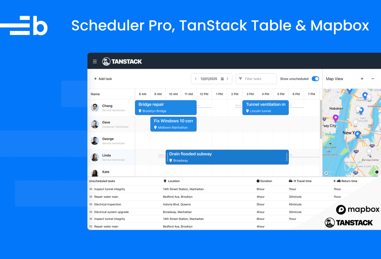 Bryntum Scheduler Pro is an advanced scheduling JavaScript UI component for the web. In this guide, we’ll show you how to integrate Bryntum Scheduler Pro with TanStack Table, a headless UI for building feature-rich JavaScript tables, and the map library, Mapbox GL JS.