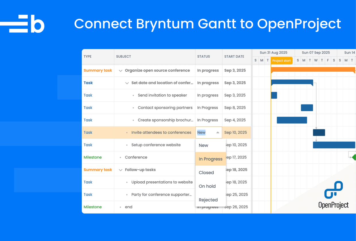 In this tutorial, we show you how to connect and sync Bryntum Gantt to an OpenProject project. OpenProject is a web-based open source project management software suite with a free community plan and paid enterprise plans. It can be self-hosted and includes a Gantt chart view.