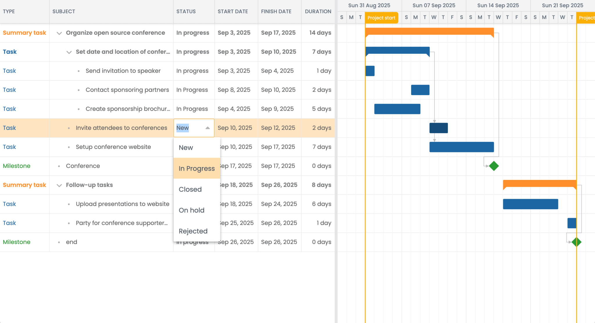 To demonstrate the flexibility of the Bryntum Gantt component, let’s style it to resemble the OpenProject Gantt. We’ll change the Type column text color, change the taskbar colors, and add a Status column.