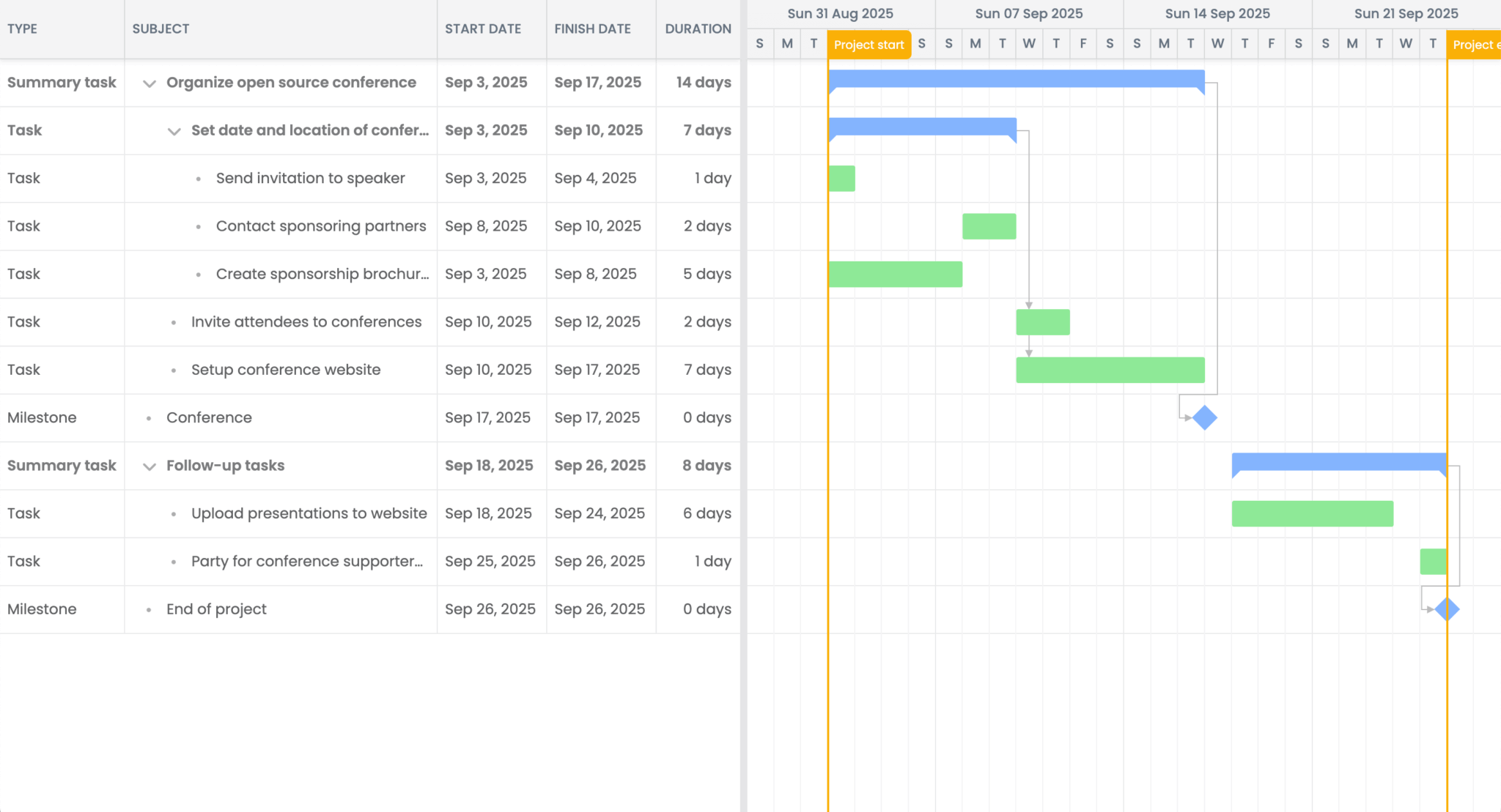 Each task in the Gantt chart is a work package. A work package is an item in a project, such as a task, feature, user story, bug, or change request. Each work package has an ID, type, and subject. Work packages can also have additional fields, such as status, due date, and description. Some of the Gantt Chart tasks have relations to other tasks, which are called dependencies in the Bryntum Gantt.
