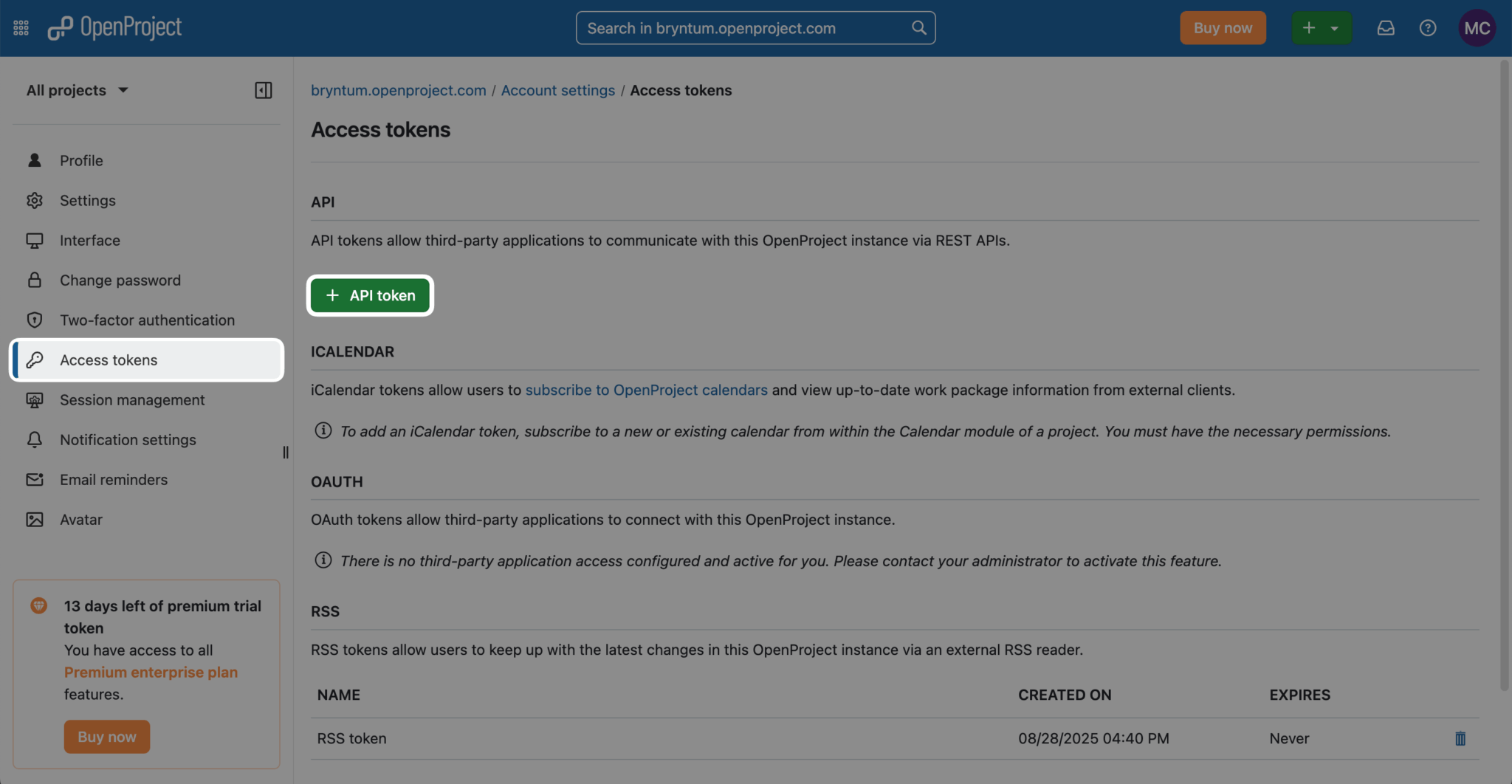 OPENPROJECT_ACCESS_TOKEN=your-api-tokenAlso add your OpenProject base URL, which you can find in the search bar at the top of the screen, to the .env file: