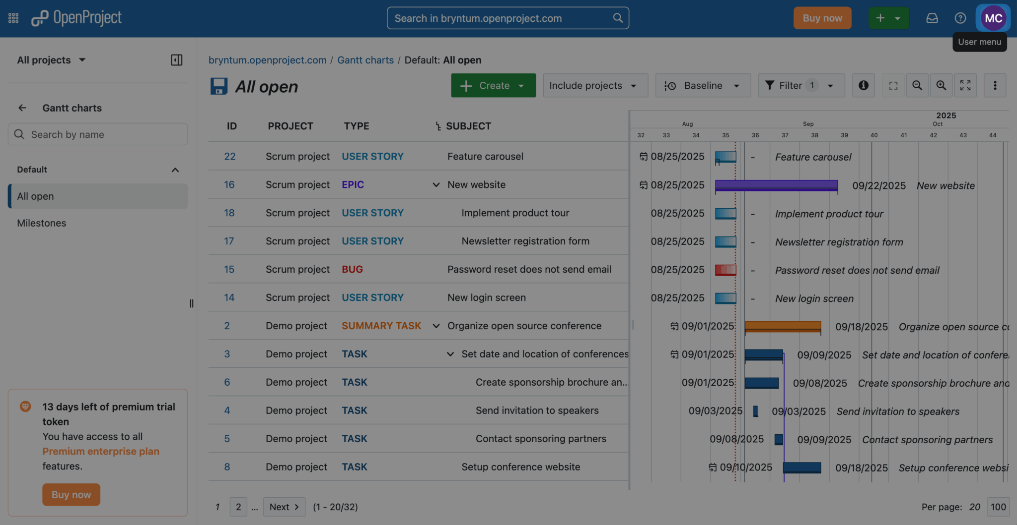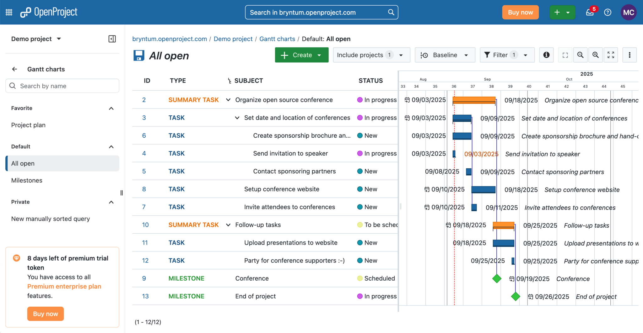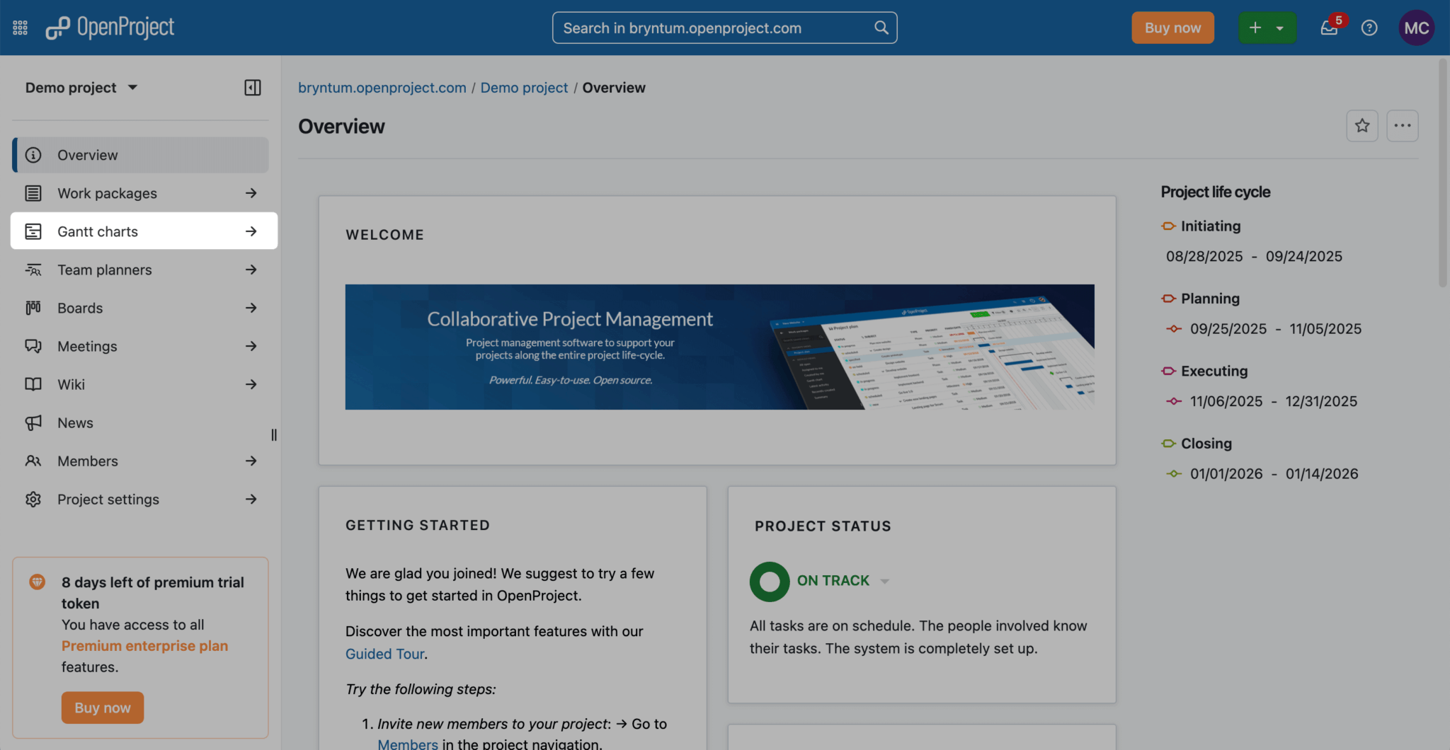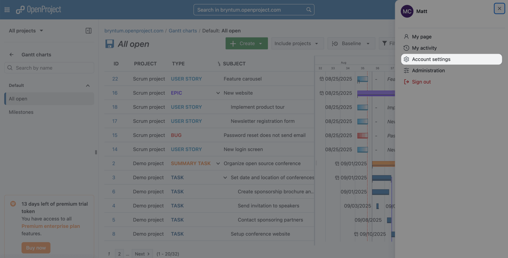 In this tutorial, we show you how to connect and sync Bryntum Gantt to an OpenProject project. OpenProject is a web-based open source project management software suite with a free community plan and paid enterprise plans. It can be self-hosted and includes a Gantt chart view.
