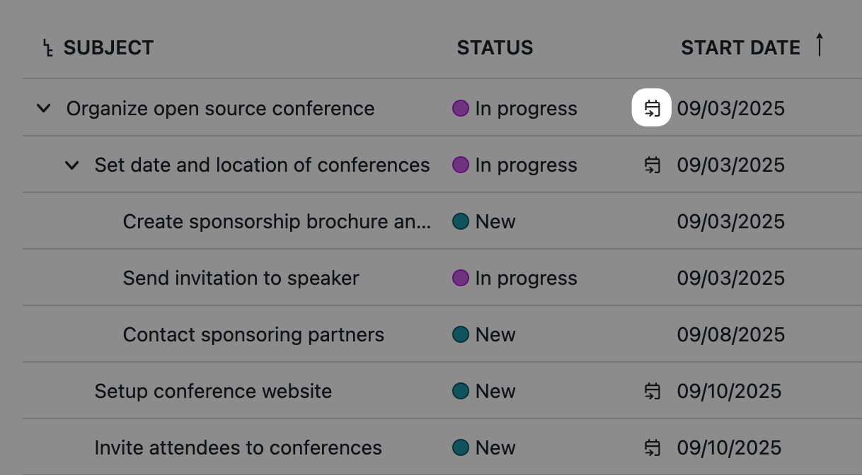 Work packages with an auto-date symbol next to the date indicate they’re in automatic scheduling mode: