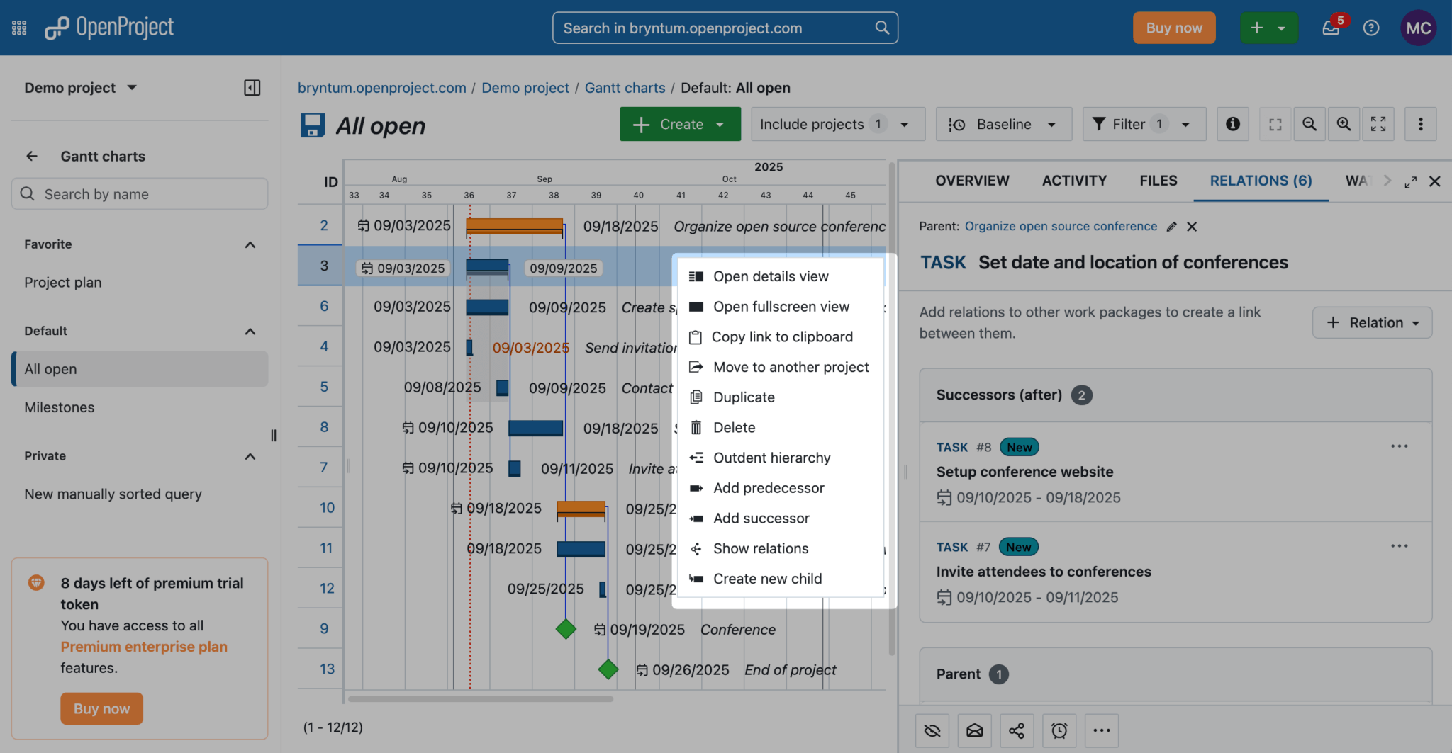 Right-click on a work package task to open the quick context menu. There are several actions you can carry out on a work package task, including Open details view, which lets you edit the work package task and its relations: