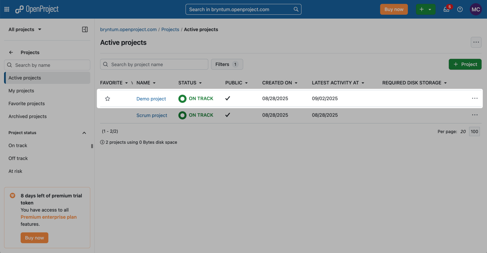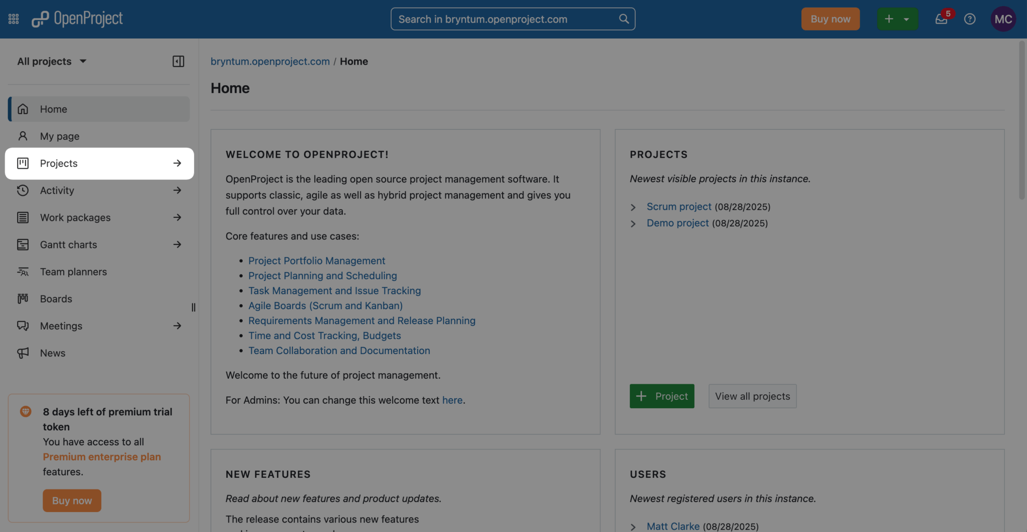 Now let’s create an OpenProject project. If you don’t have an OpenProject account, sign up for a 14-day free trial of the Basic plan, which includes cloud hosting and enterprise features. You can also use the free Community plan, which requires self-hosting.