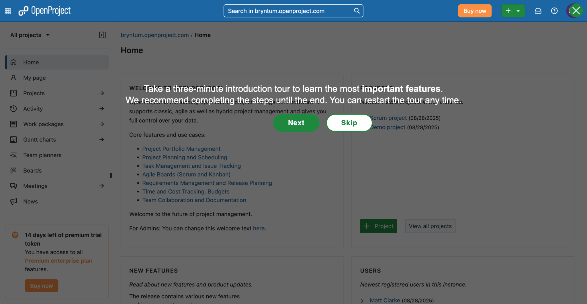 Once you’ve signed up and logged in, take the introduction tour to get familiar with the OpenProject UI.