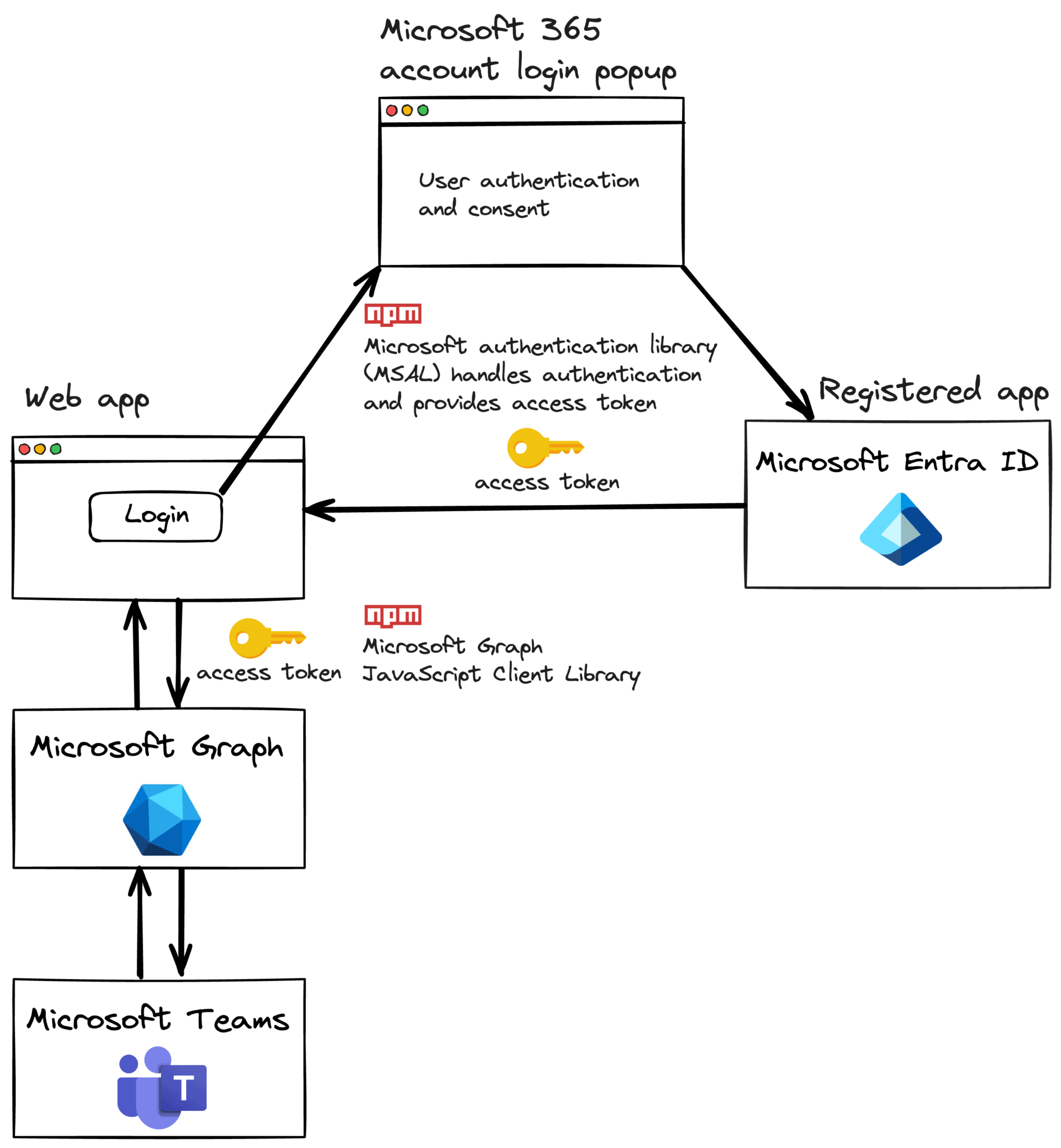 We’re going to register a Microsoft 365 application by creating an application registration in Microsoft Entra ID, which is a cloud identity and access management (IAM) solution. We’ll do this so that a user can sign in to our app using their Microsoft 365 account. This grants our app access to the data the user gives the app permission to access. A user signs in using OAuth, which sends an access token to our app to be stored in session storage. We’ll then use the token to make authorized requests for Microsoft Teams data using Microsoft Graph. Microsoft Graph is a single endpoint REST API that enables you to access data from Microsoft 365 applications.