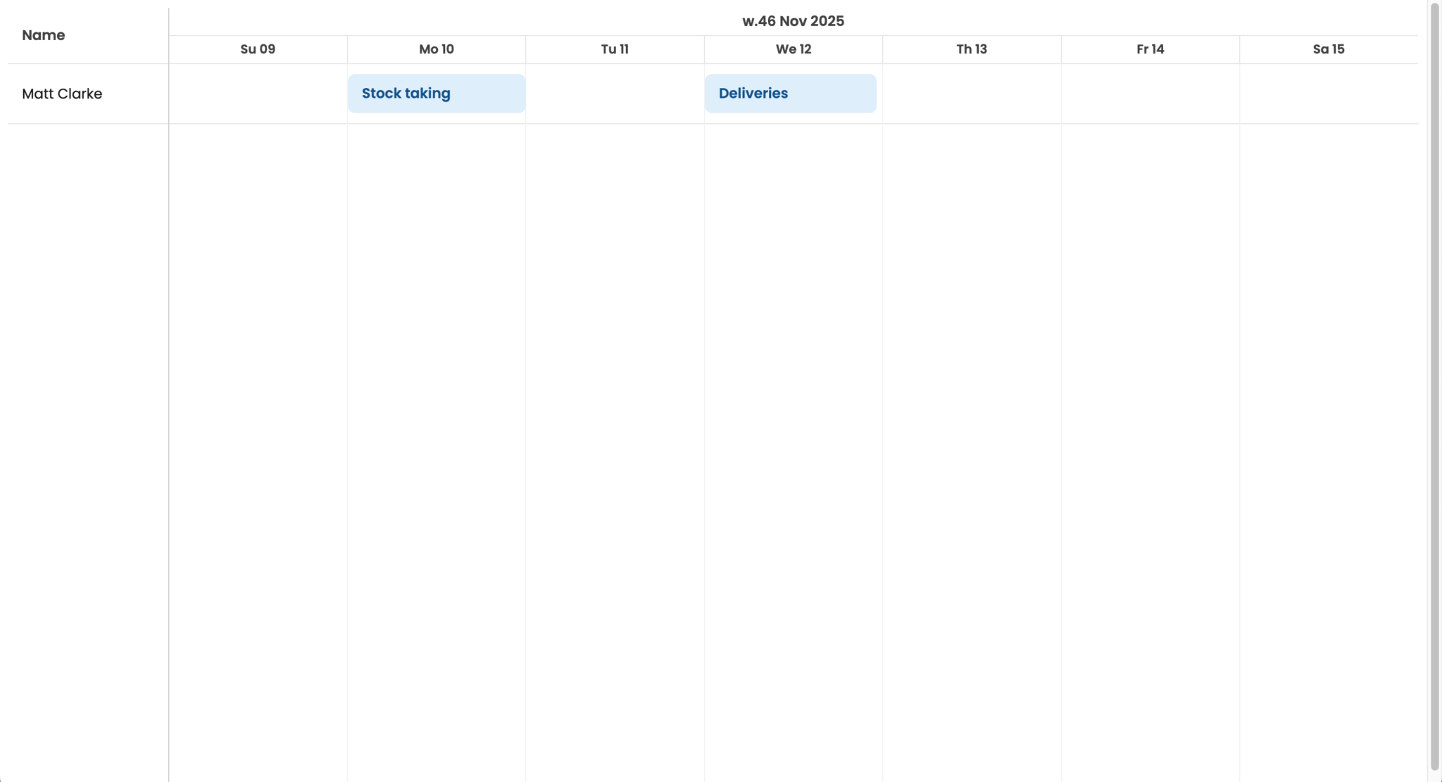 We pass in data inline to populate the scheduler resources and events stores for simplicity. You can learn more about working with data in the Bryntum docs. We have a resource for two individuals. Within the scheduler, there’s an example "shift" event for each individual that runs for a week. If you run your dev server now, you’ll see the events in Bryntum Scheduler: