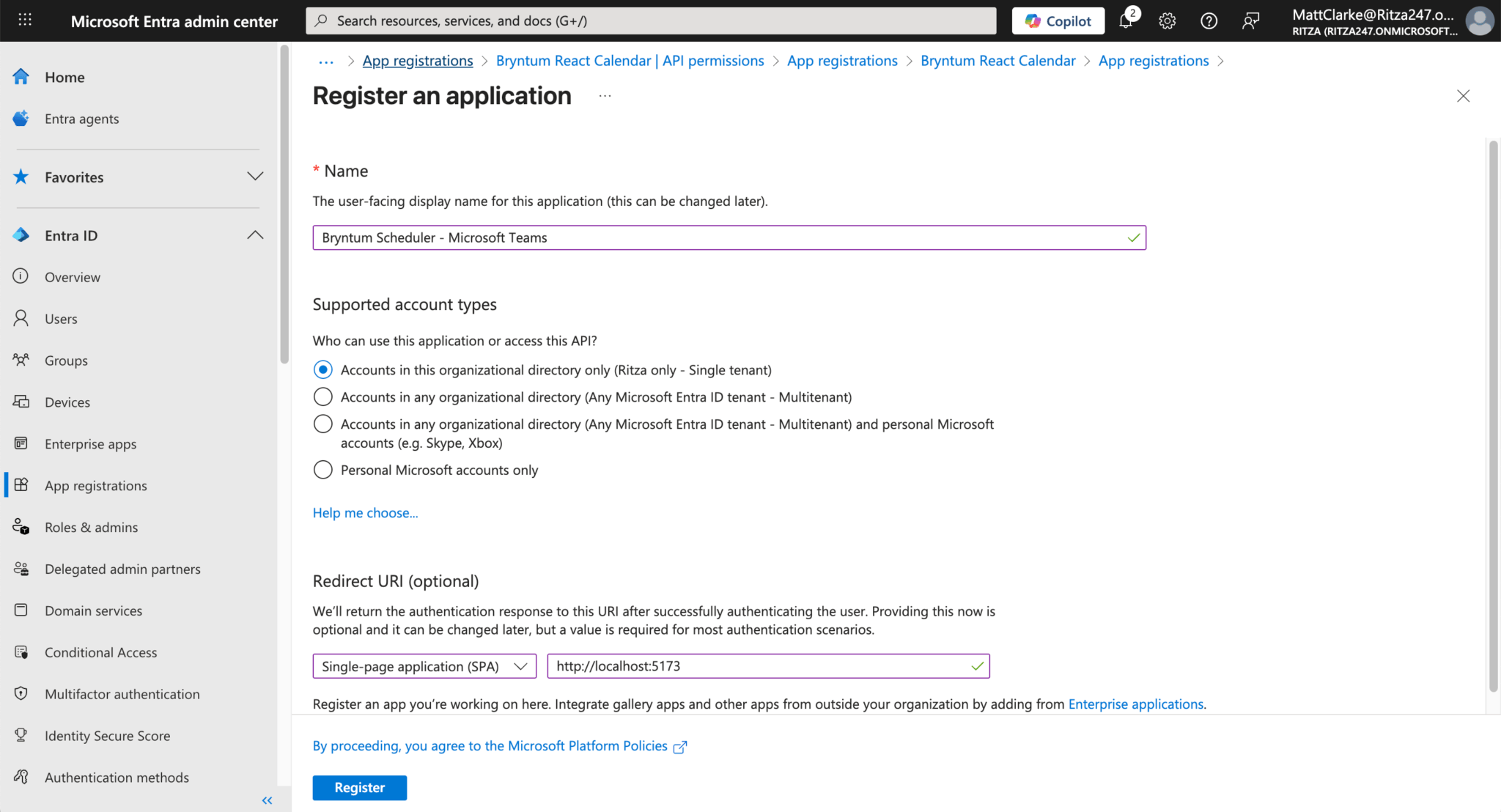 http://localhost:5173and select Single-page application (SPA). - Check that you agree with the Microsoft identity platform for developers Terms of Use and then click the Register button.