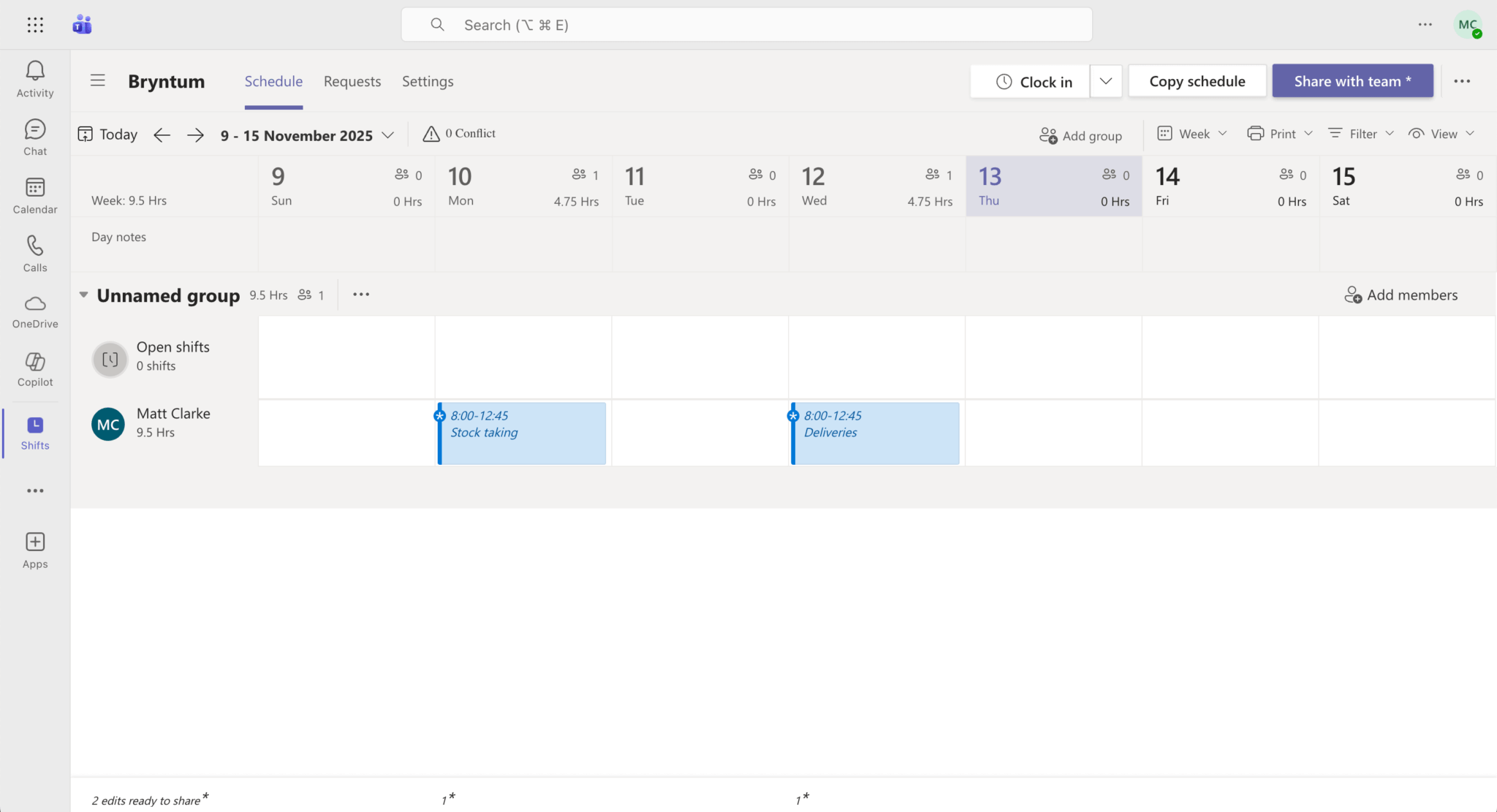 Now sign in to Microsoft Teams using the admin email address from your Microsoft 365 Developer Program account and create some events for the following week, then click the “Share with team” button to share your shifts:
