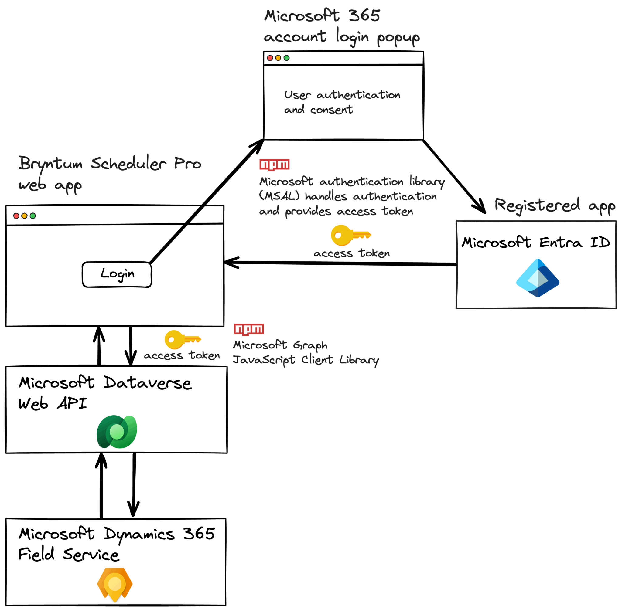The diagram below outlines how we’ll access the Microsoft Field Service work orders and resource bookings from the Bryntum Scheduler Pro web app. When a user logs into the app, Microsoft Entra ID is used to authenticate the user. The access token returned by Microsoft Entra ID will be used to connect to Microsoft Field Service via the Microsoft Dataverse Web API.