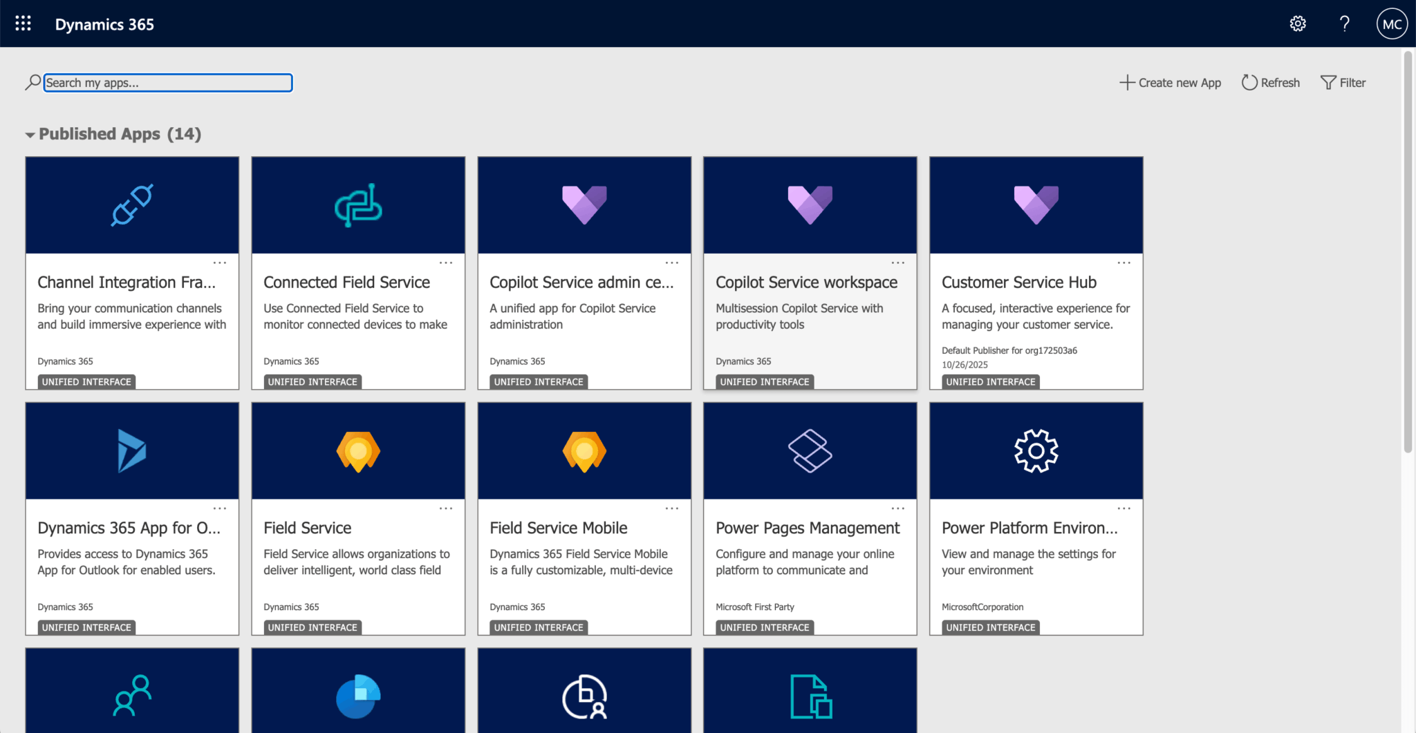 This opens your environment in a new tab. After the page loads, you’ll see a list of Dynamics 365 apps in your environment, including Field Service: