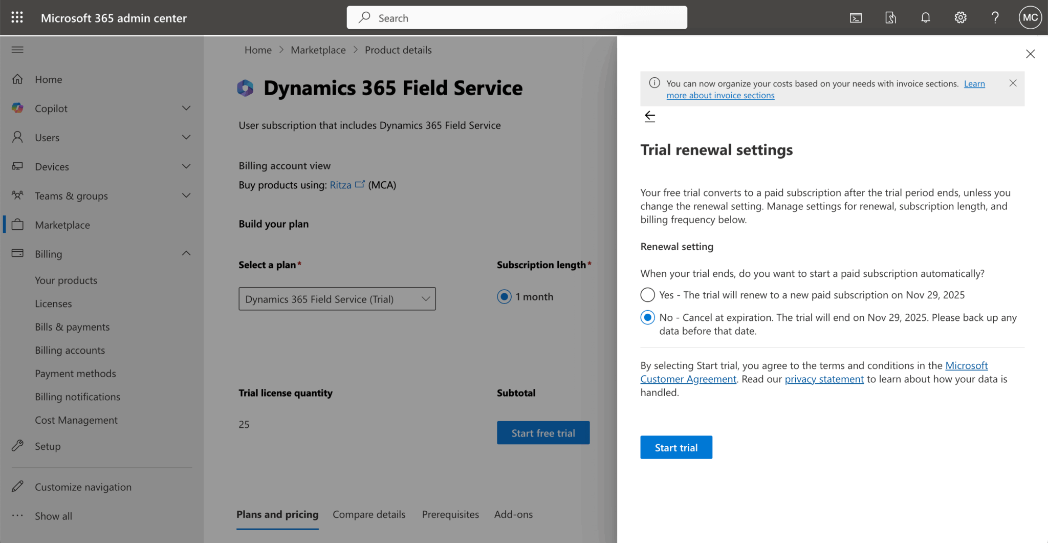 If you don’t have access to Dynamics 365 Field Service, you can sign up for a free trial here or in the Microsoft 365 admin center under Marketplace. You can set your trial to cancel after the trial period ends.