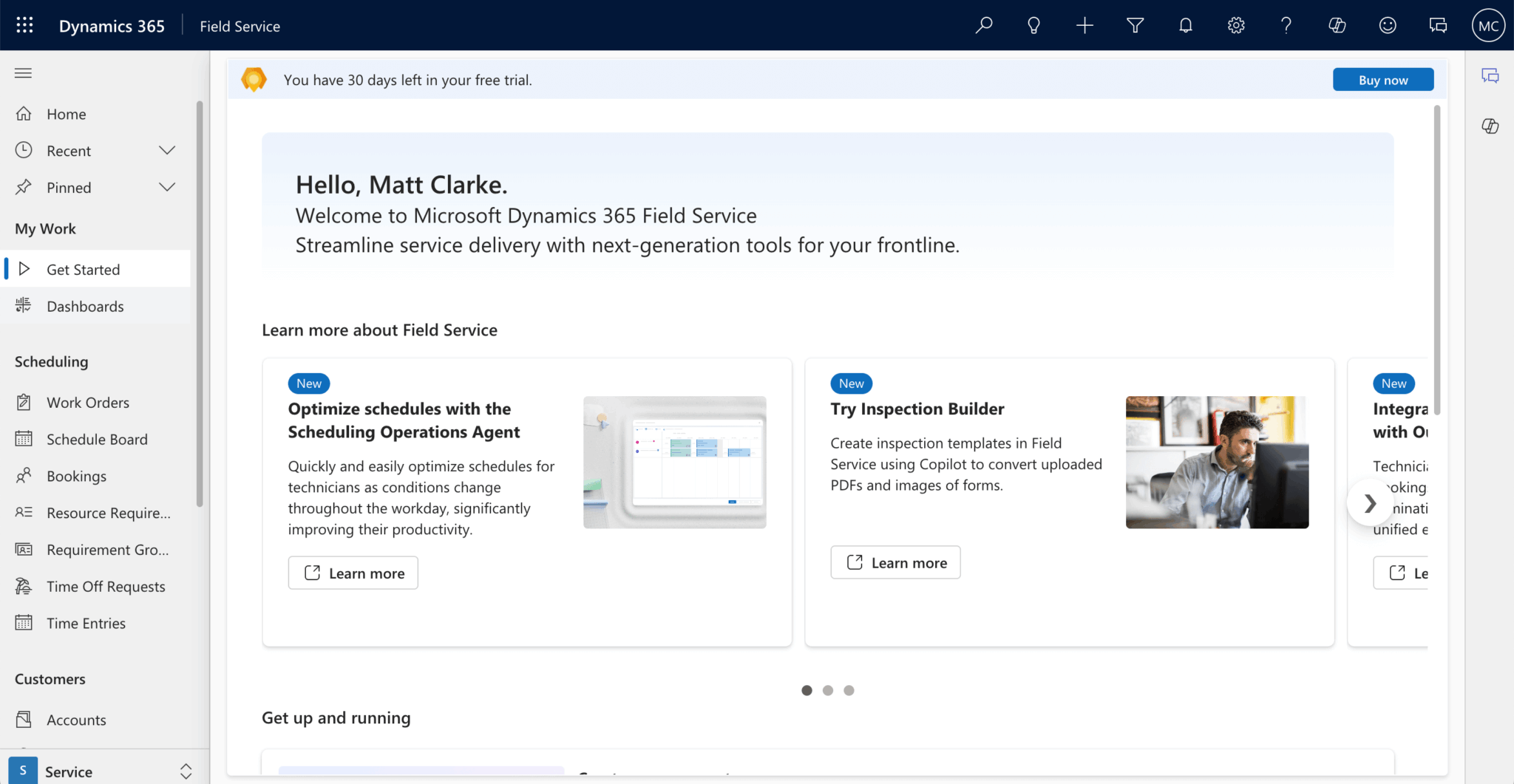 The Get up and running section on the home page lets you set up accounts and create and schedule work orders. We’ll use the example data already added to Field Service.