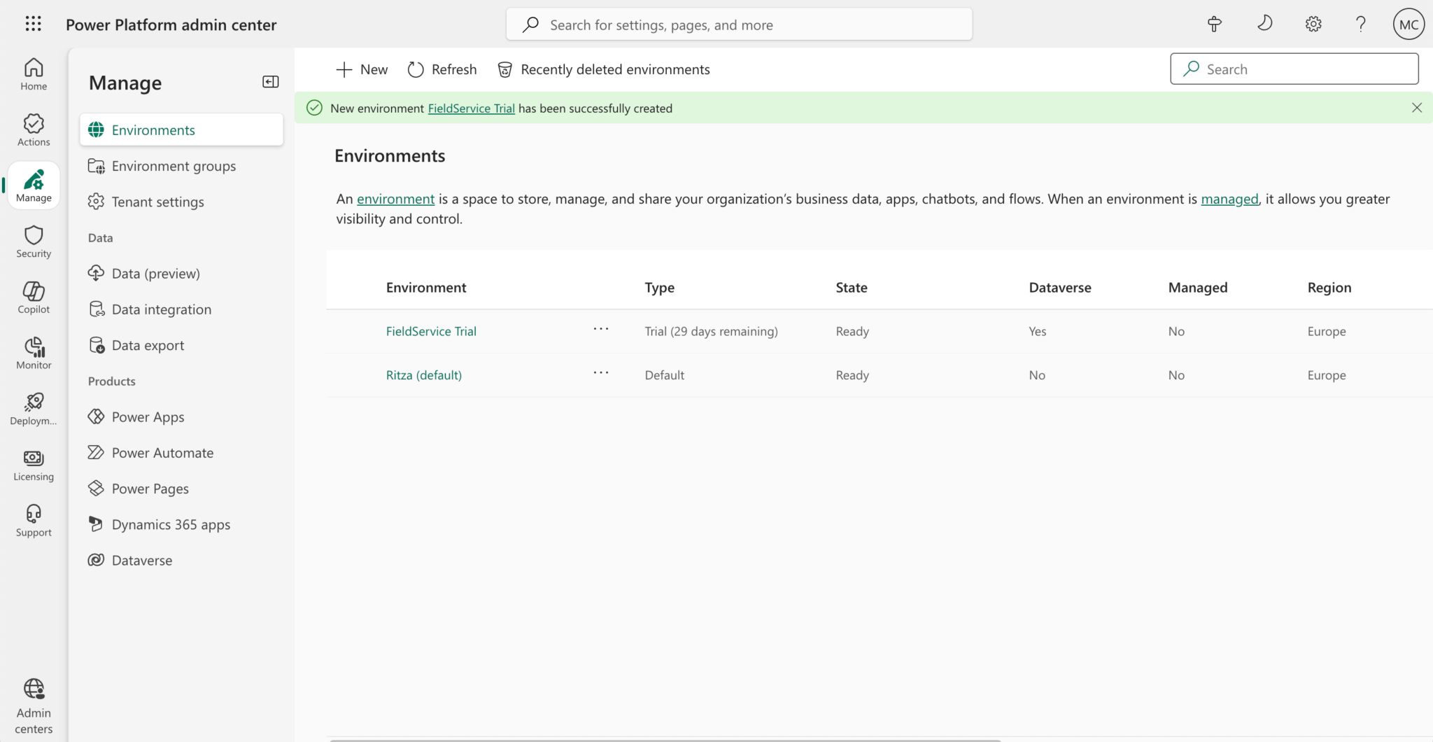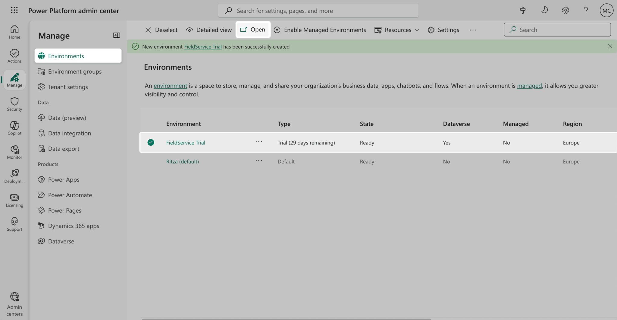 Once you’ve signed up, you can find the Field Service Trial in the Power Platform admin center under Environments.