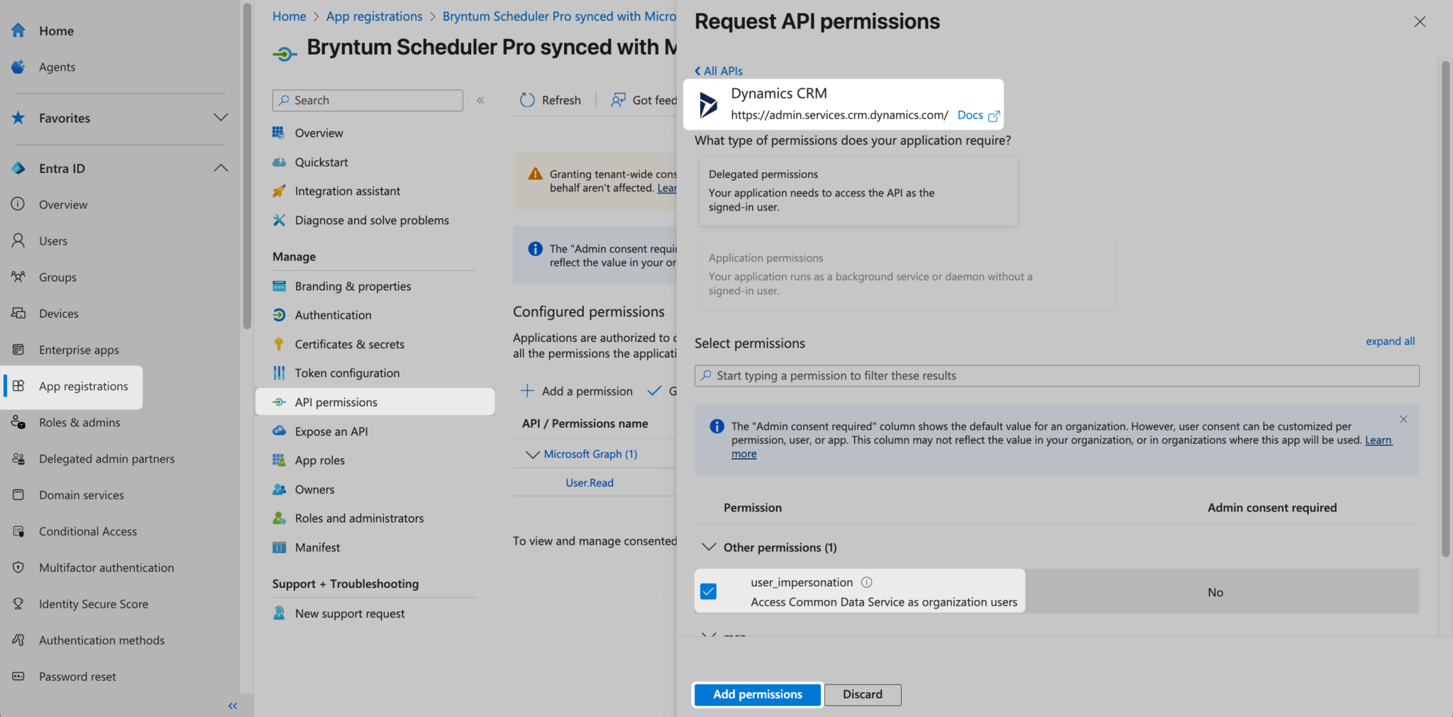 Under Select permissions, check the user_impersonation permission. Finally, click the Add permissions button.