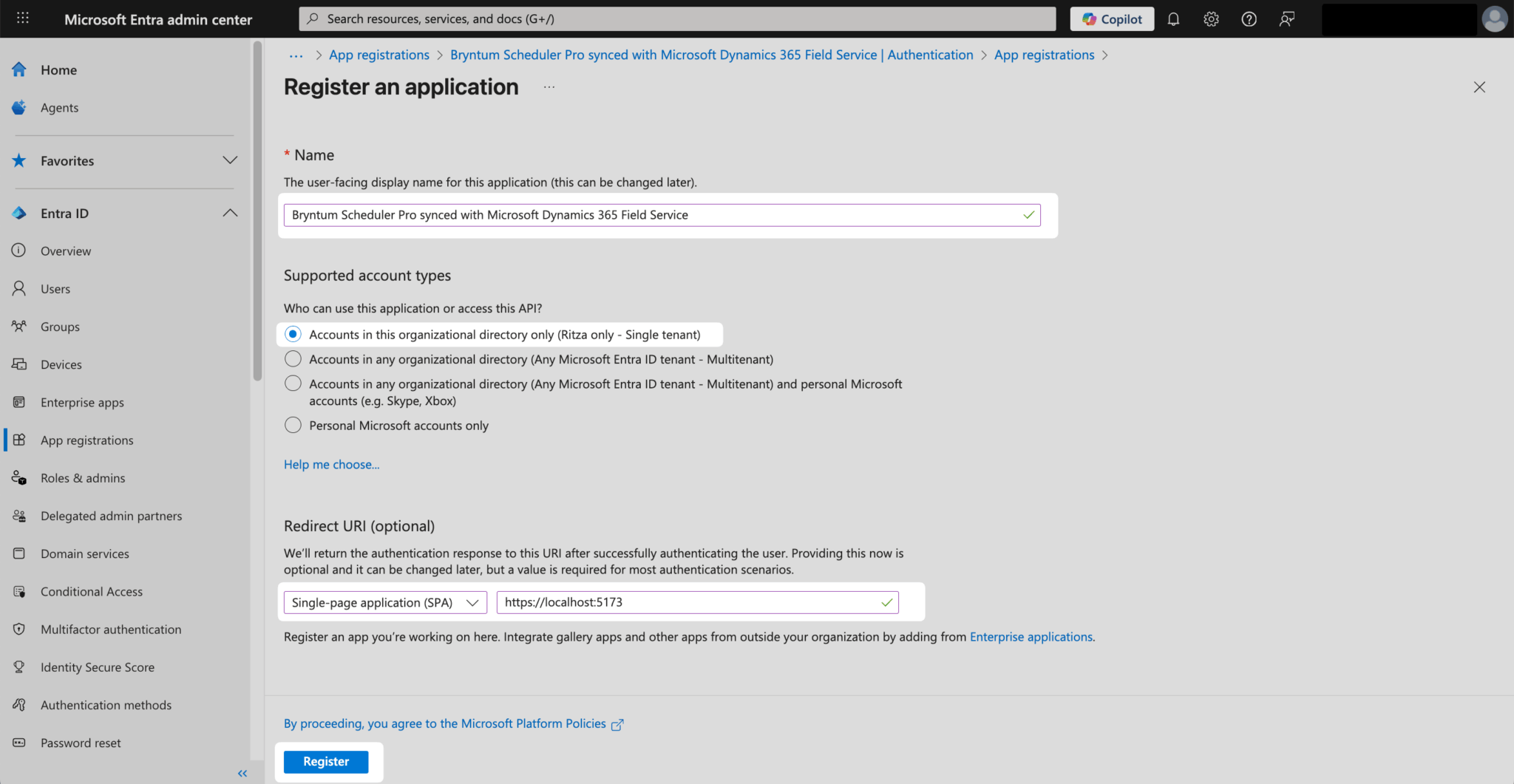 Set the Redirect URI to http://localhost:5173, select “Single-page application (SPA)” from the dropdown menu, and then click Register.