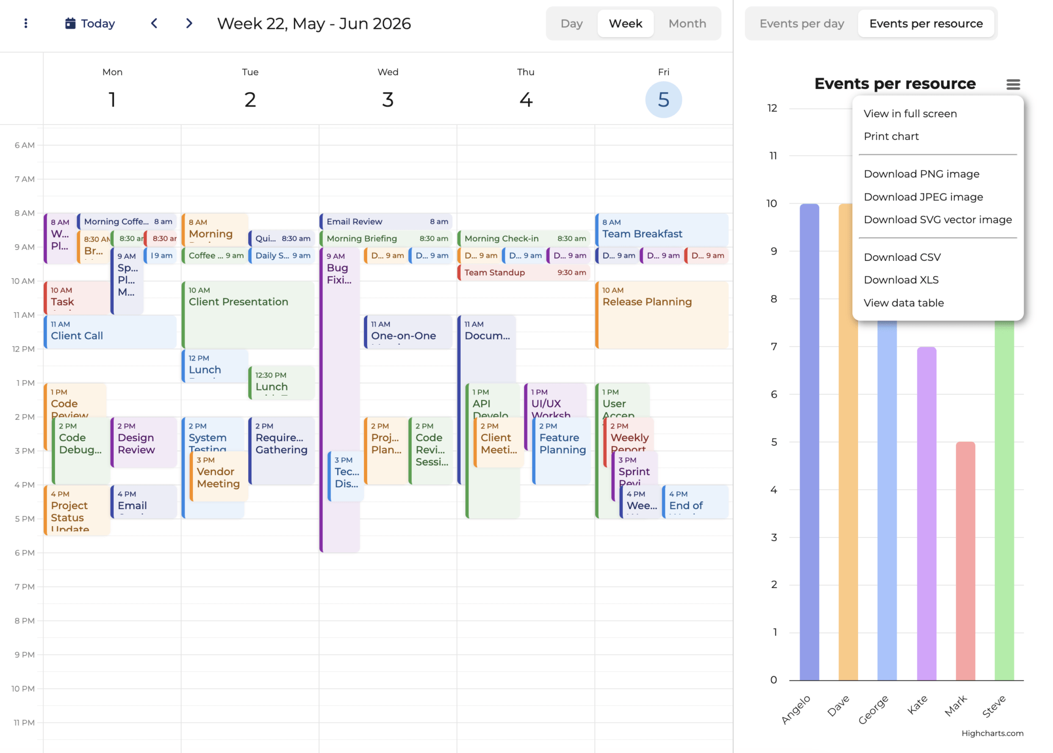 You can explore the complete, working demo on the Bryntum website: Calendar with Highcharts. This demo showcases the final result of the integration you’ll build in this guide.