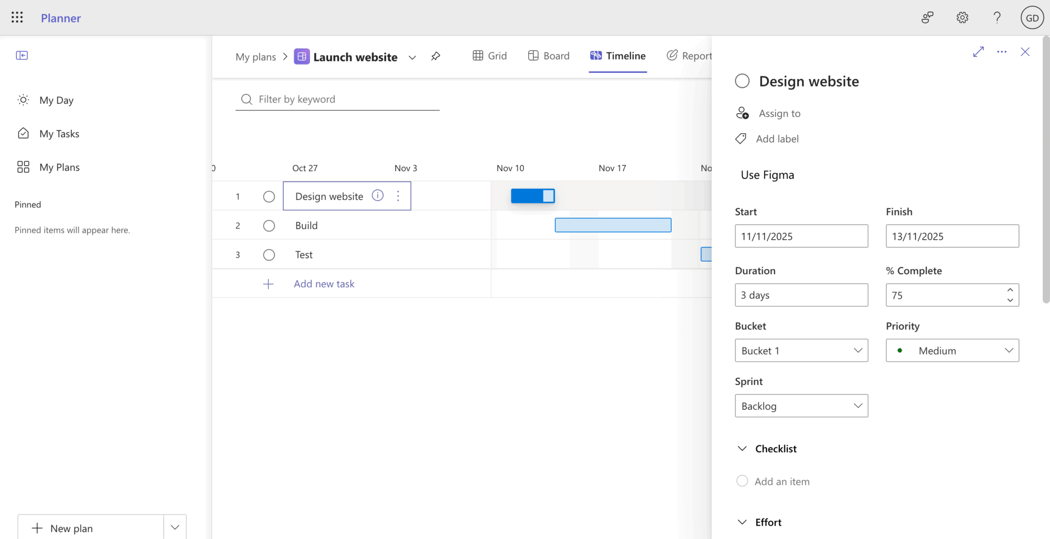 We added custom Priority and Bucket fields to the Bryntum Gantt chart. You can add other Microsoft Planner plan fields that we didn’t add, including Label, Checklist, Effort, Attachments, and Goals.