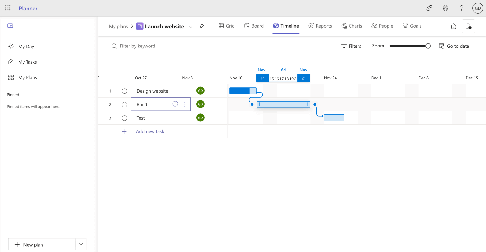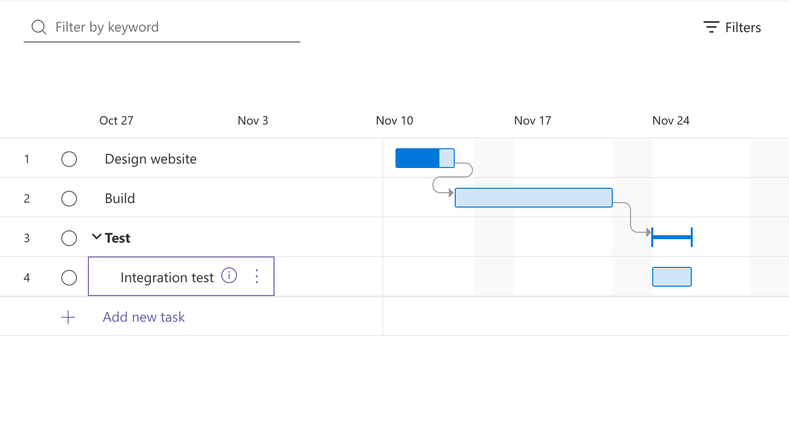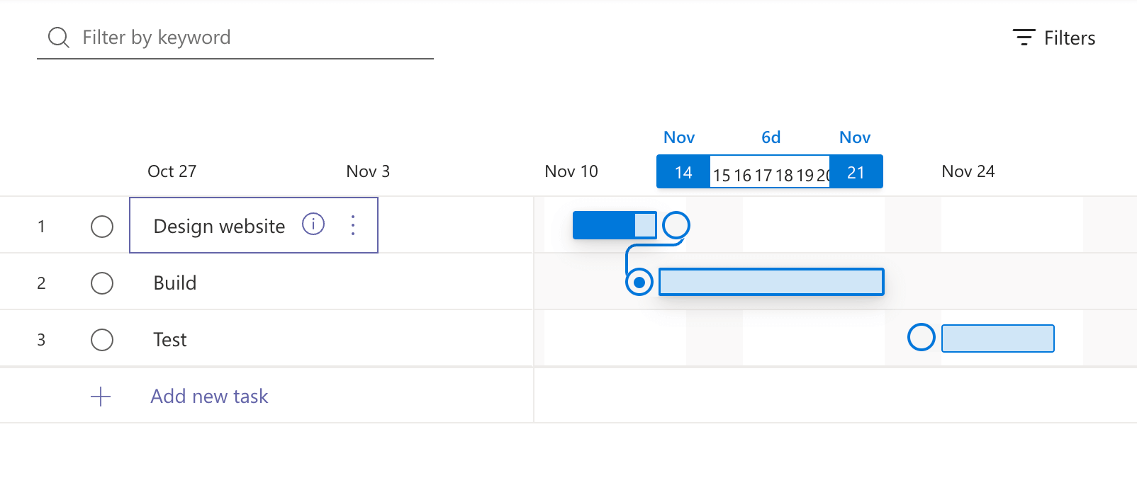 Create a dependency between some tasks by hovering your cursor over a task bar, and clicking and dragging the white circle on the side of the task bar until it connects to another task.