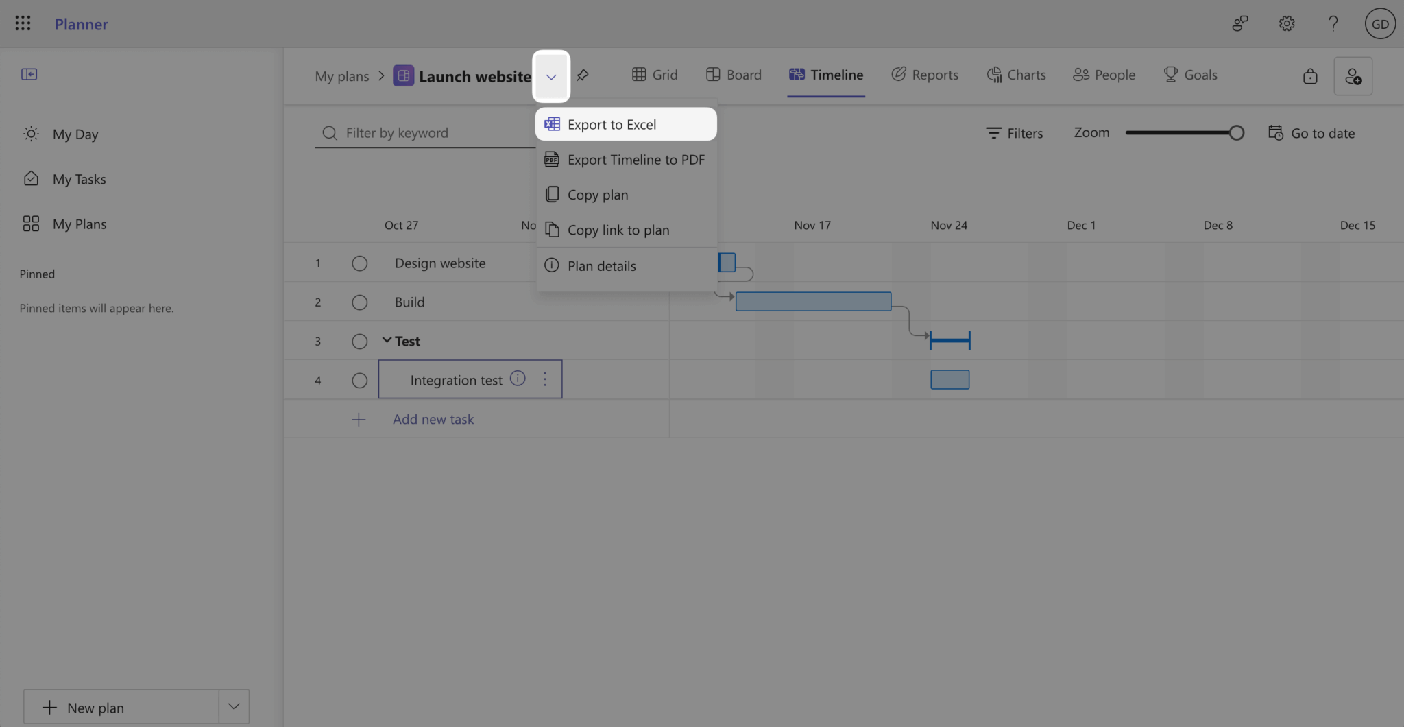 To export the plan data to an Excel file, click the More actions dropdown button to the right of the plan name and select Export to Excel: