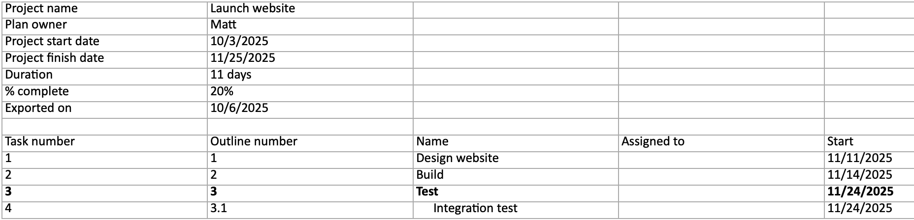 ⚠️ If you’re using your own Excel file, replace the values with your Excel file name and the project name in your Excel file. The project name is used to find the outline numbers of the tasks in the Excel file. You may need to adjust your Excel file to match this format or adjust the migration script code for your Excel file format.