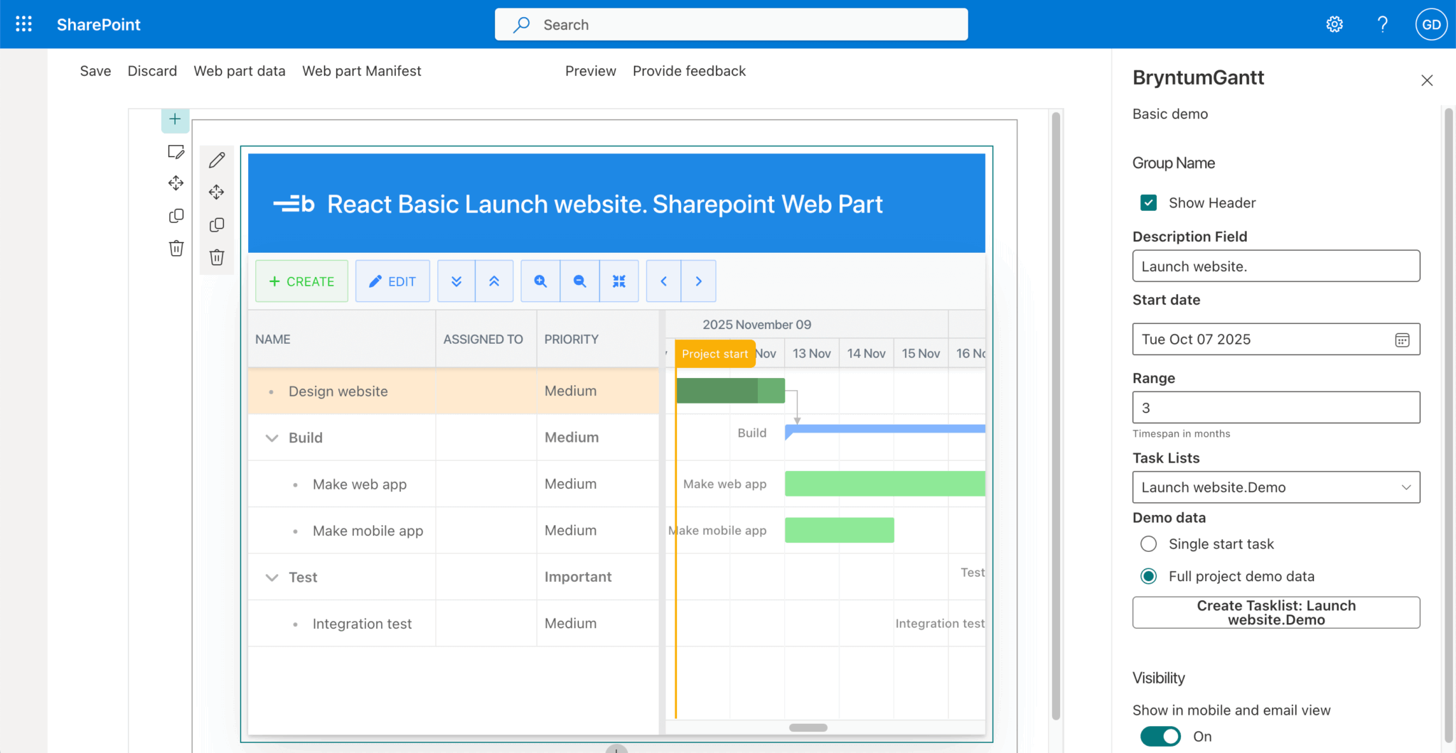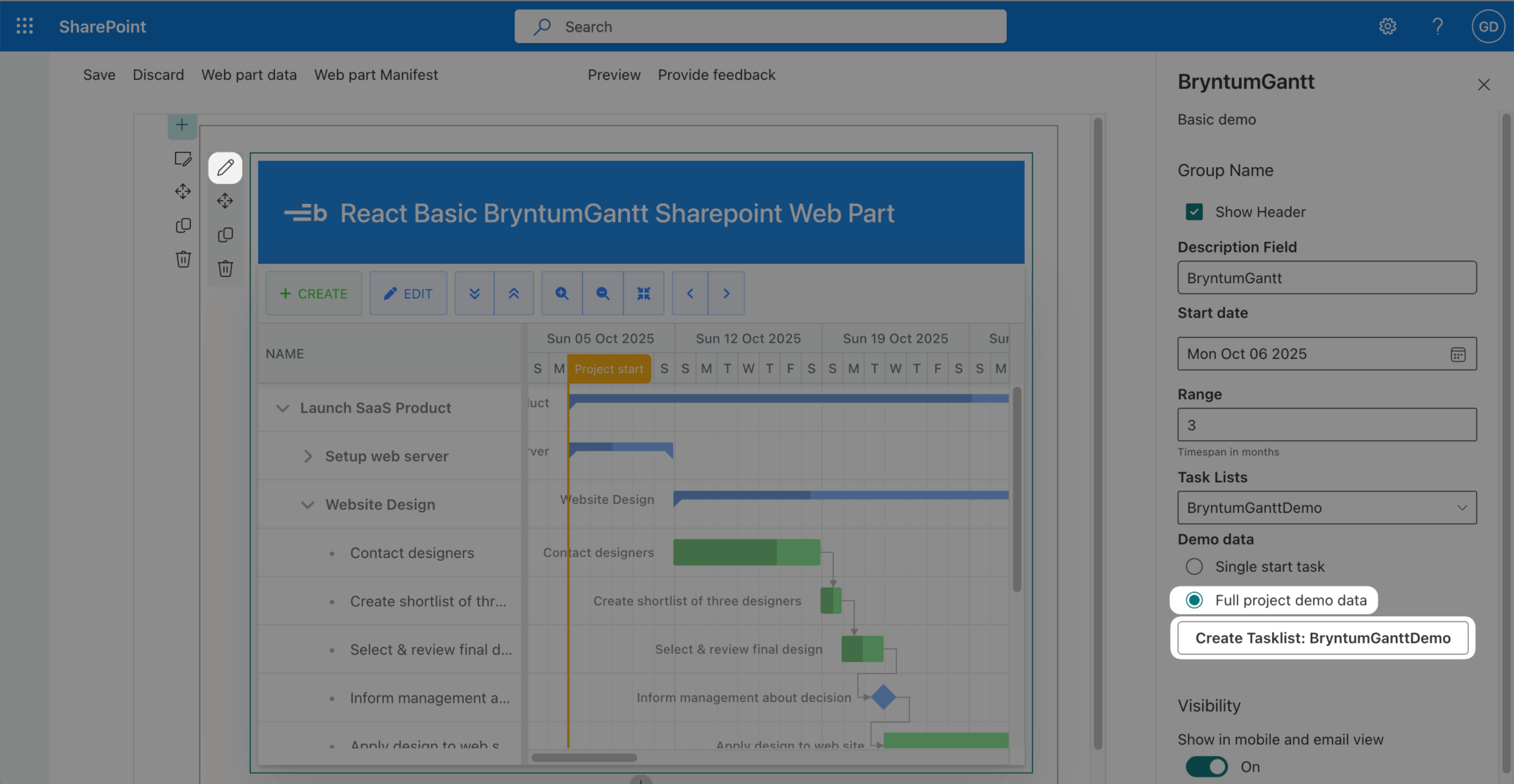 The Bryntum Gantt SharePoint web part has some initial demo data. To add data to your Bryntum Gantt SharePoint web part, click the pencil icon in the top-left corner of the web part. In the web part property pane that opens, select the Full project demo data radio button and click Create Tasklist: BryntumGanttDemo.