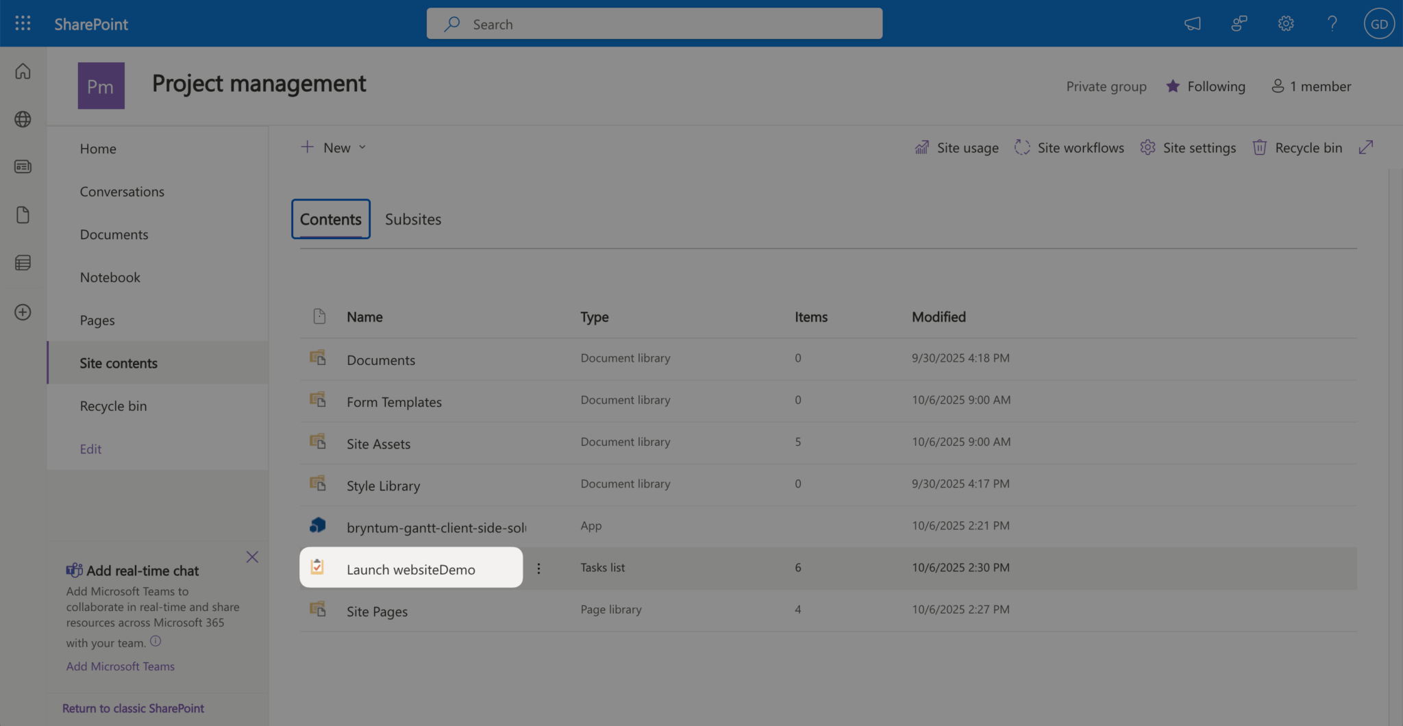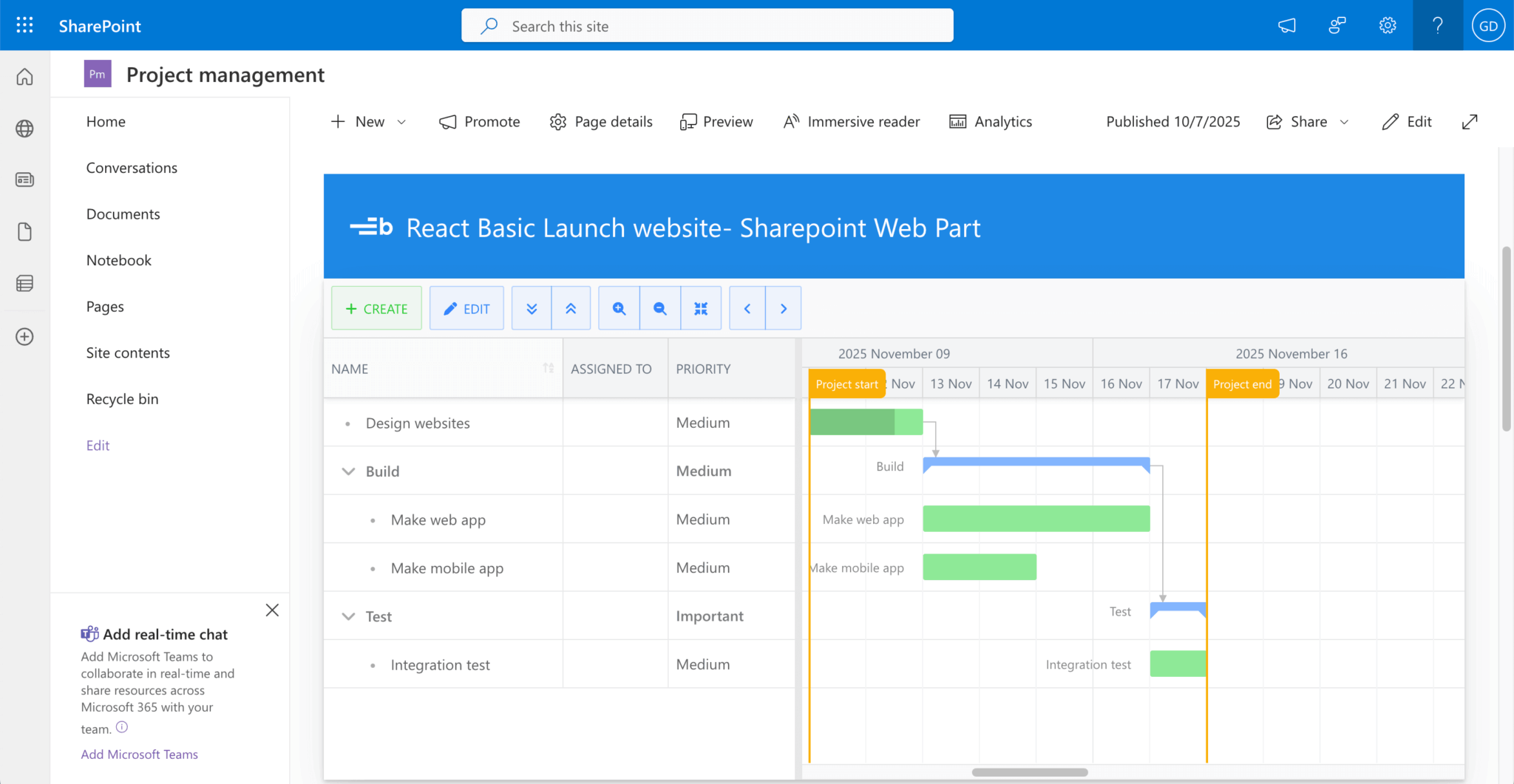 Now go to your SharePoint tenant site and create a team site if you don’t have one already. Install the Bryntum Gantt app on your team site. Next, create a page if your team site does not have one, and add your Bryntum Gantt app web part to your page. Add the demo data as you did when developing locally in SharePoint workbench.