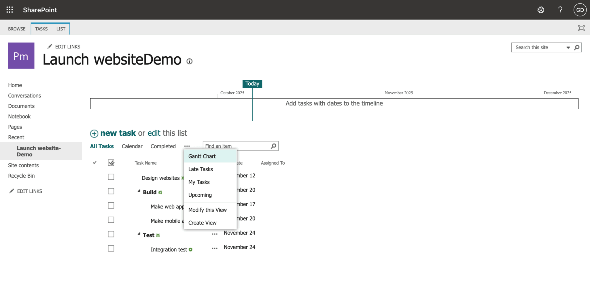 You can view the task list data source in the Site contents of your team site. Click on the Launch websiteDemo task list item.