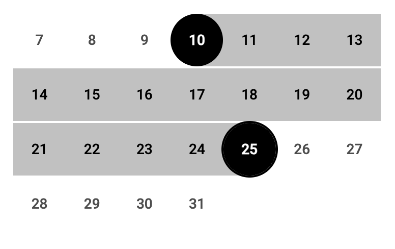 Change the range color to a darker grey by setting the b-date-picker-selected-range-background CSS variable to #c1c1c1: