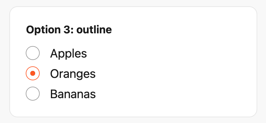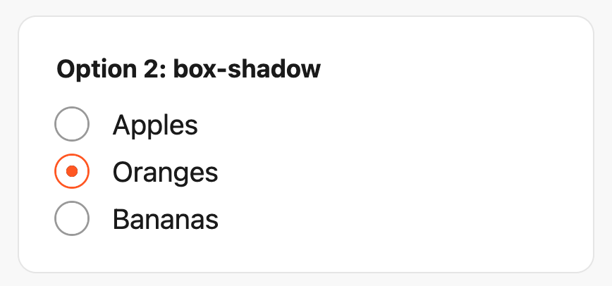Nearly identical to the box-shadow method, this approach also uses appearance: none to hide the native button and adds a white border as spacing directly around the dot. Here, however, we use outline for the outer ring instead. When we first published this article in 2022, outlines didn’t follow border-radius in Safari. That long-standing WebKit bug was fixed in Safari 16.4, making this the cleanest option of the three.