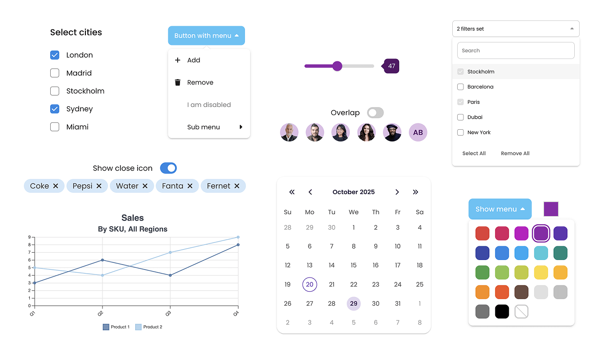 - Add buttons, menus, toggles, sliders, and more to cells or headers to let users take quick actions without leaving the grid view.