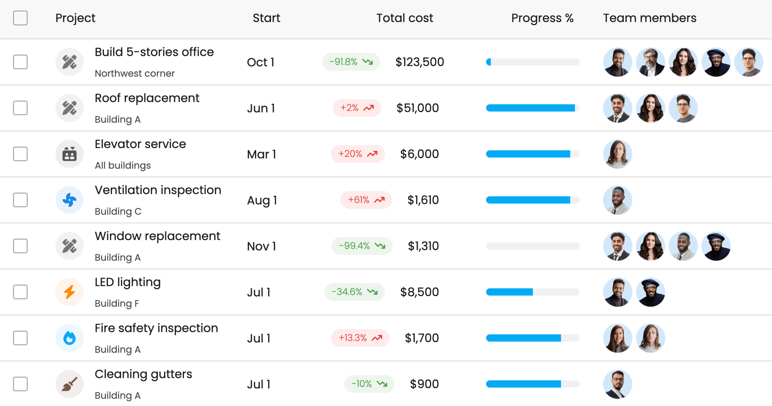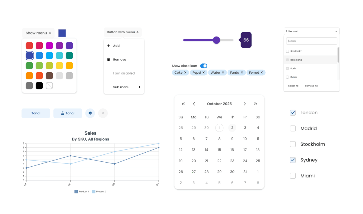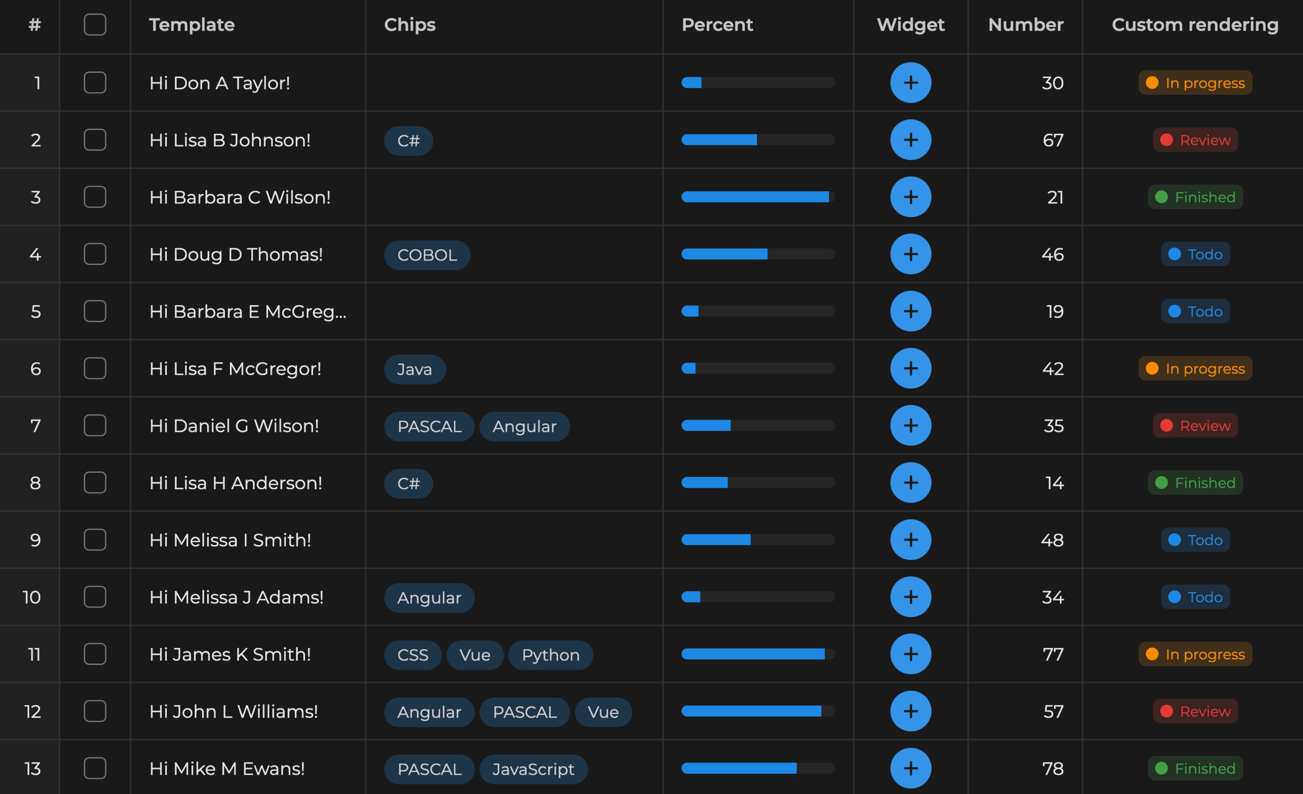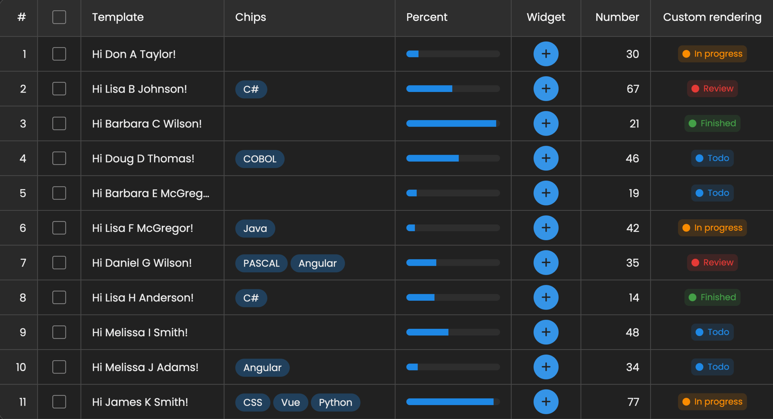 - Add buttons, menus, toggles, sliders, and more to cells or headers to let users take quick actions without leaving the grid view.