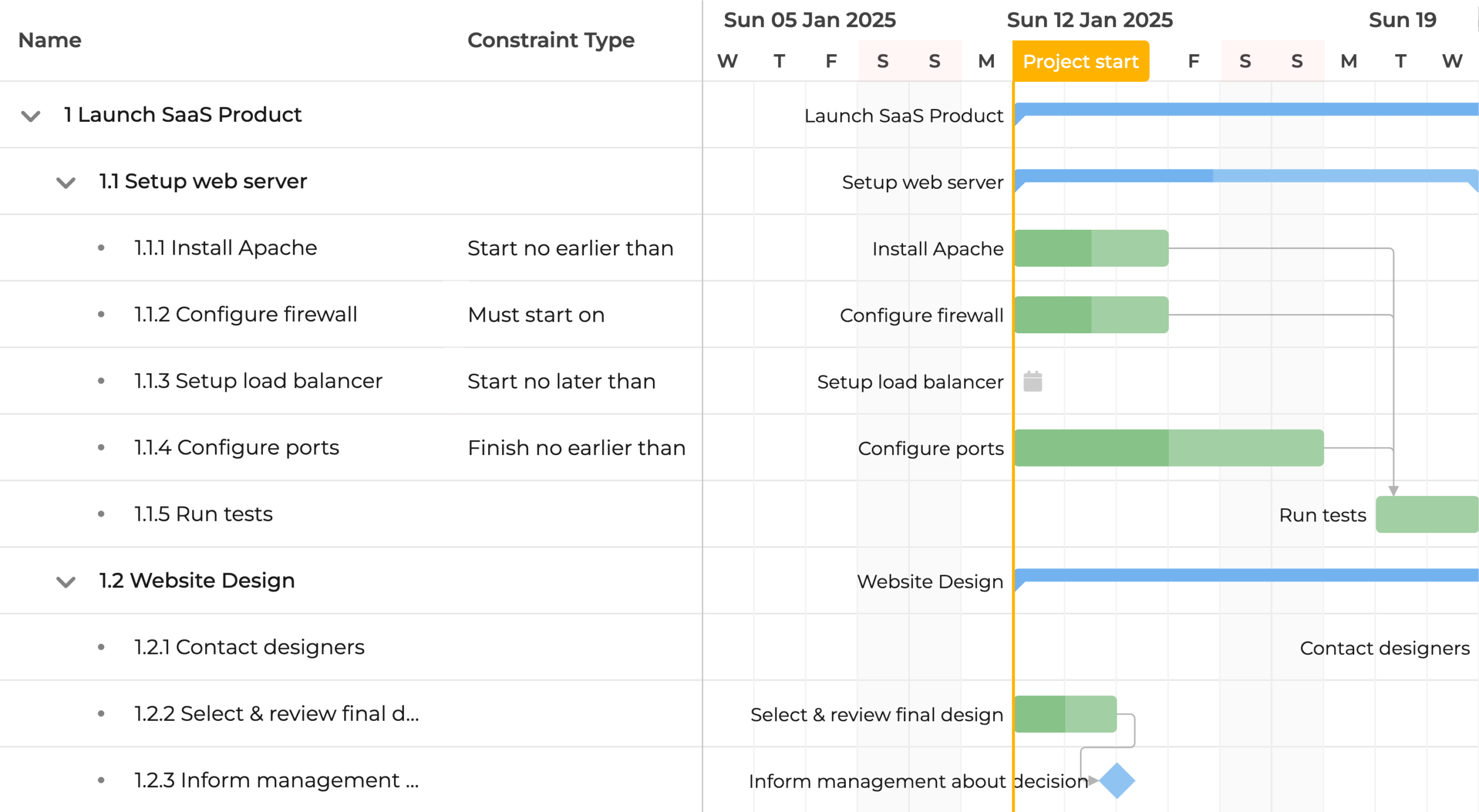 The Bryntum React Gantt engine provides asynchronous scheduling of any number of tasks by taking task dependencies, constraints, and scheduling modes into account. The Bryntum React Gantt engine is implemented independently from the DOM and can also be run on a node server.
