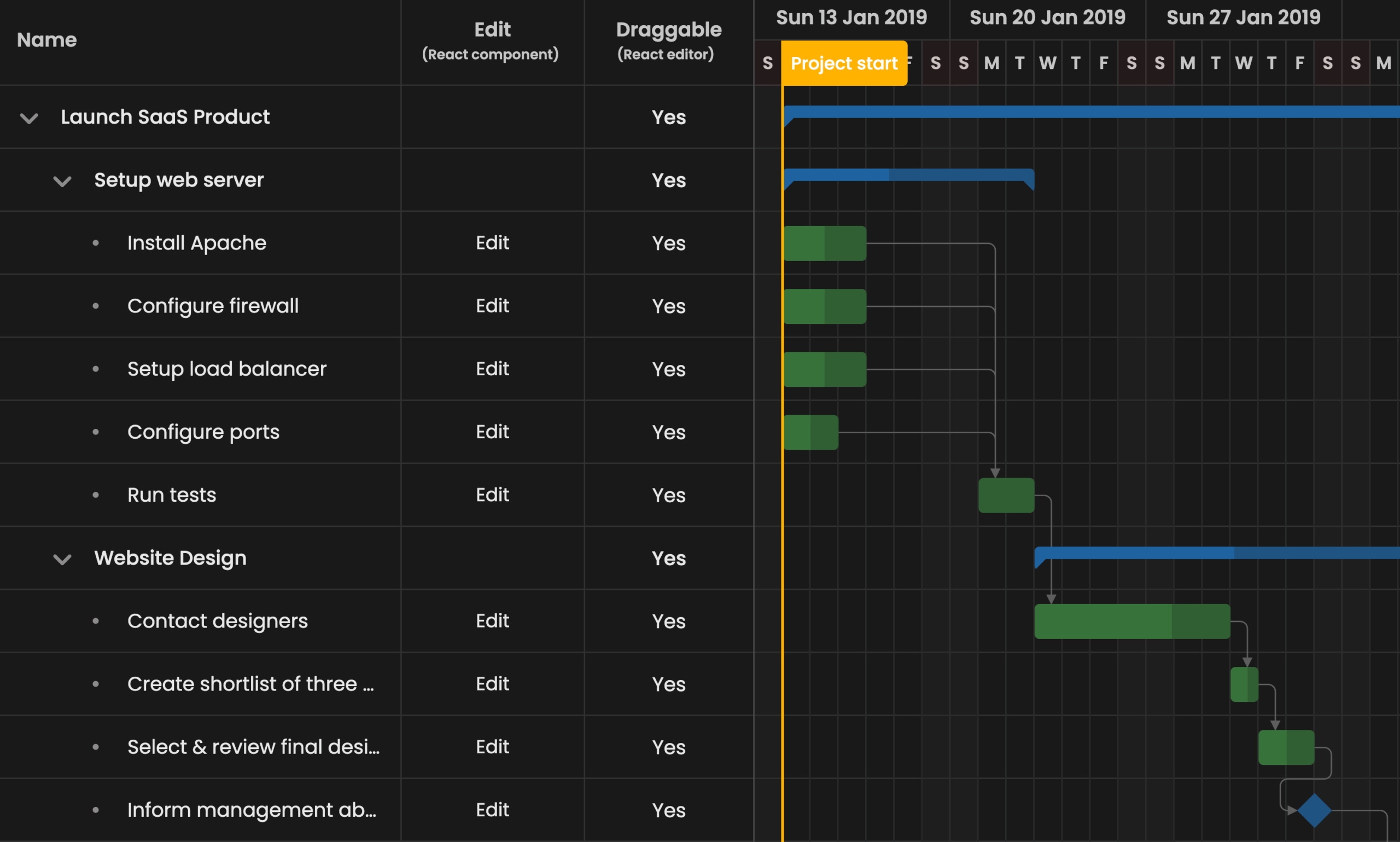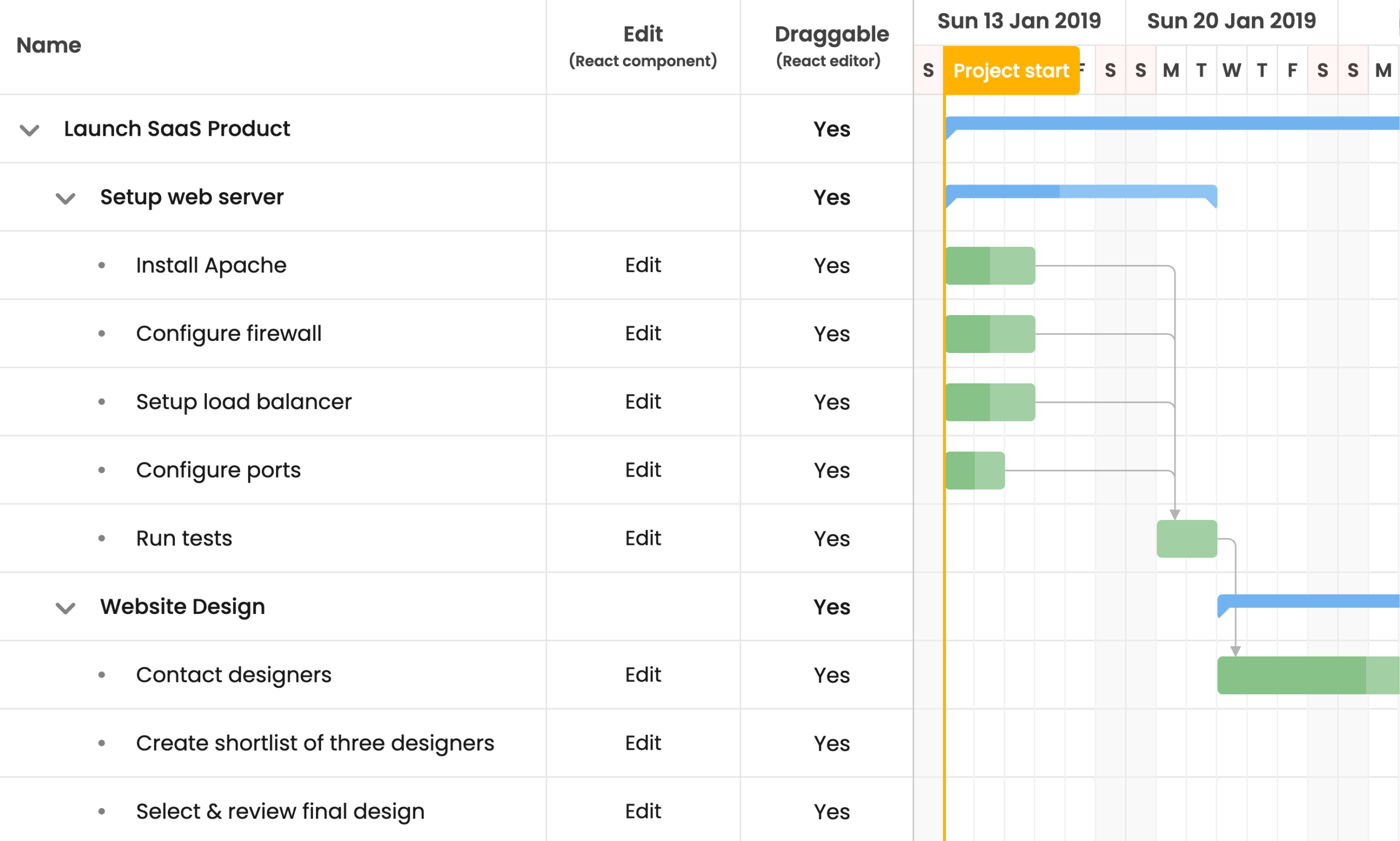 Use our React wrappers for advanced Gantt chart functionality using familiar React syntax.Â