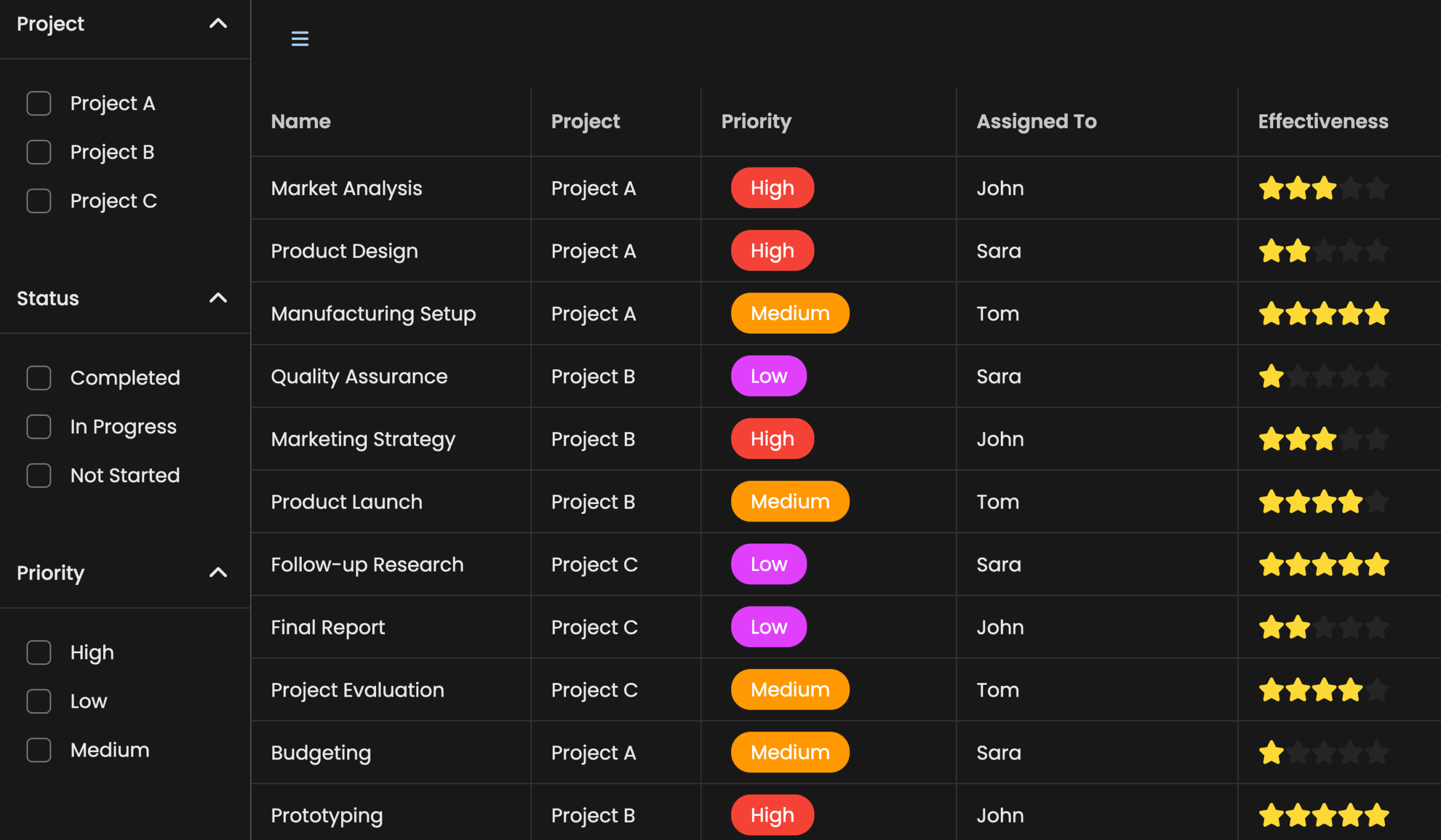 Whether you prefer ready-made styles or have your own vision, we’ve got you covered. Bryntum React Grid ships with five elegant themes you can effortlessly adapt, or create a custom theme.Â