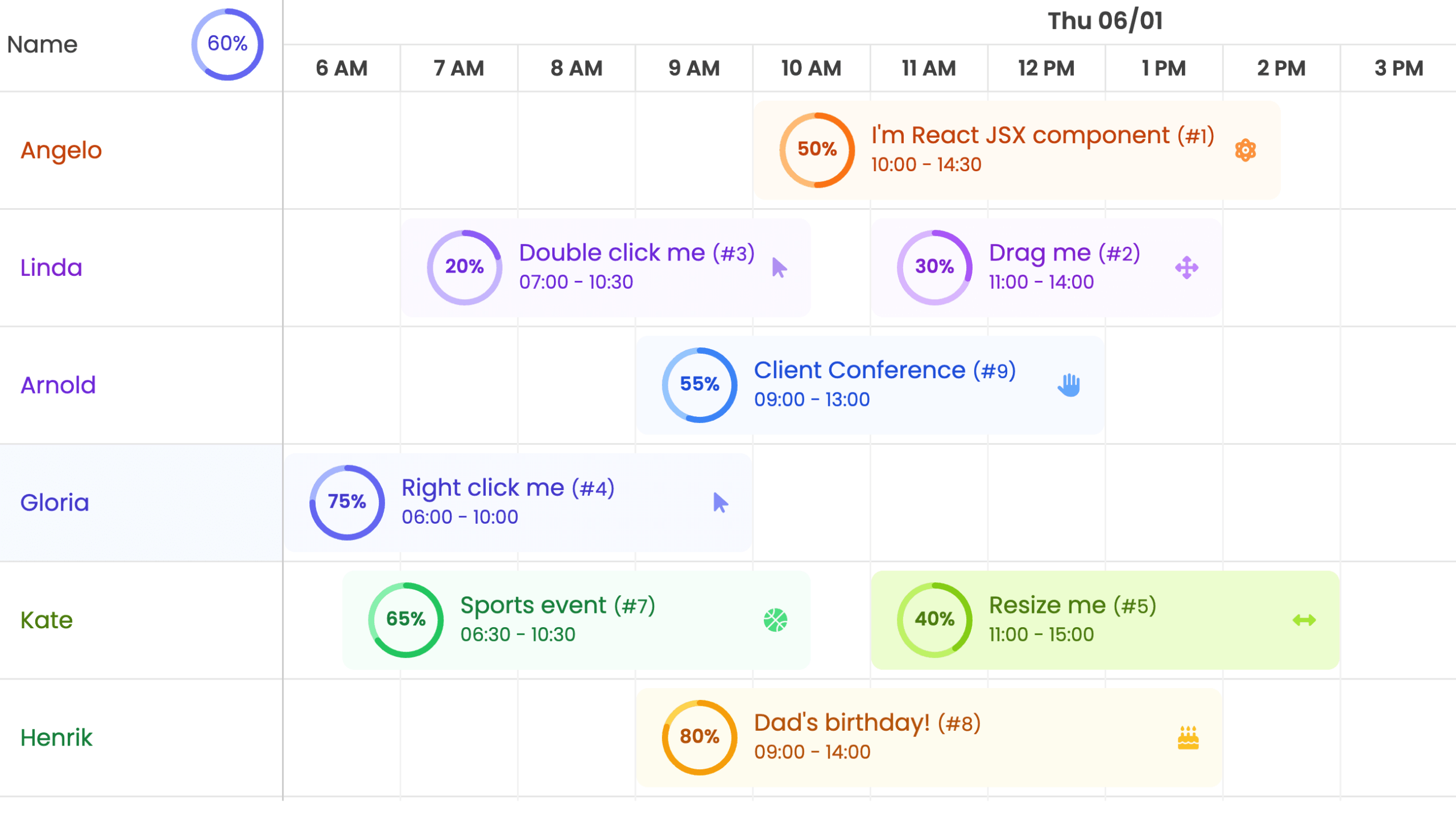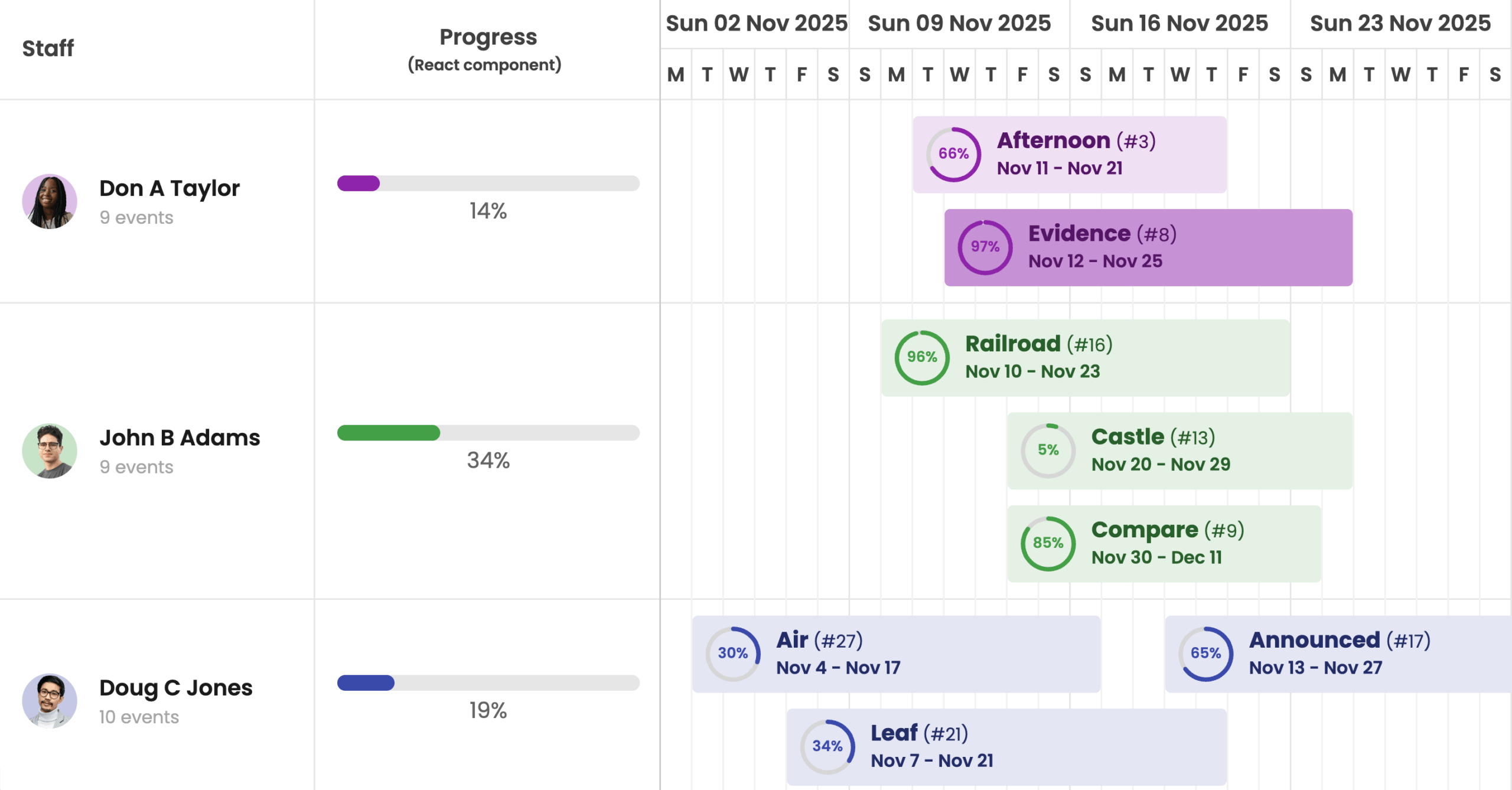 View our demo for inspiration on customizing your Bryntum React Scheduler with event progress bars, menu icons, and resource avatars.