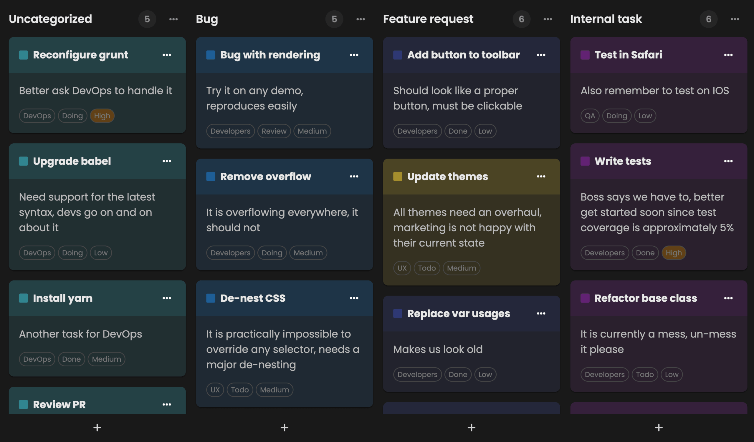 Bryntum Task Board for React is a web component with a range of built-in features to track tasks from idea to completion. Optimize your users’ workflow in a beautiful interface that’s easy to customize.