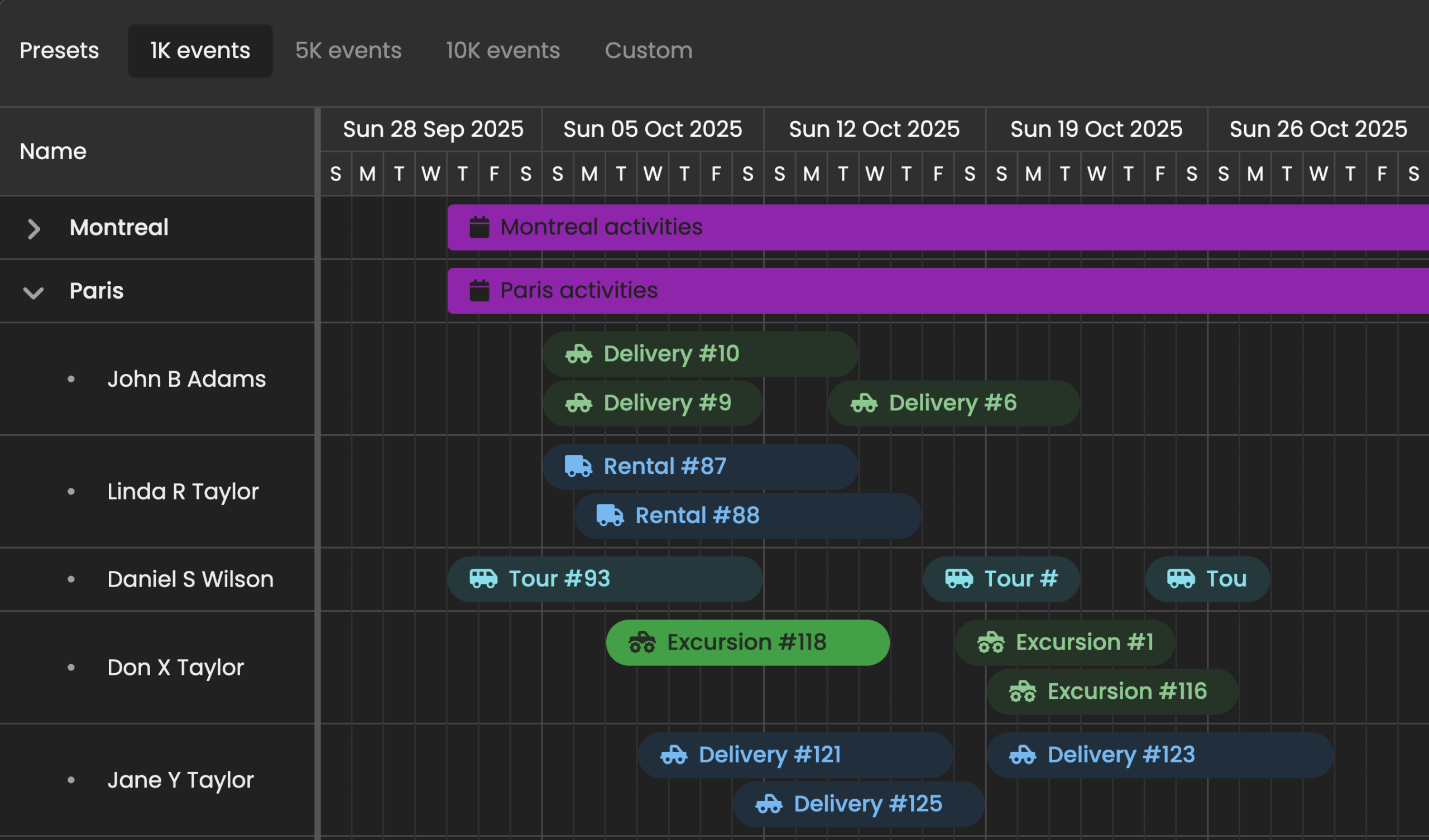 Bryntum Scheduler includes event and capacity summaries to support decision making. Schedule and plan with confidence knowing you can: