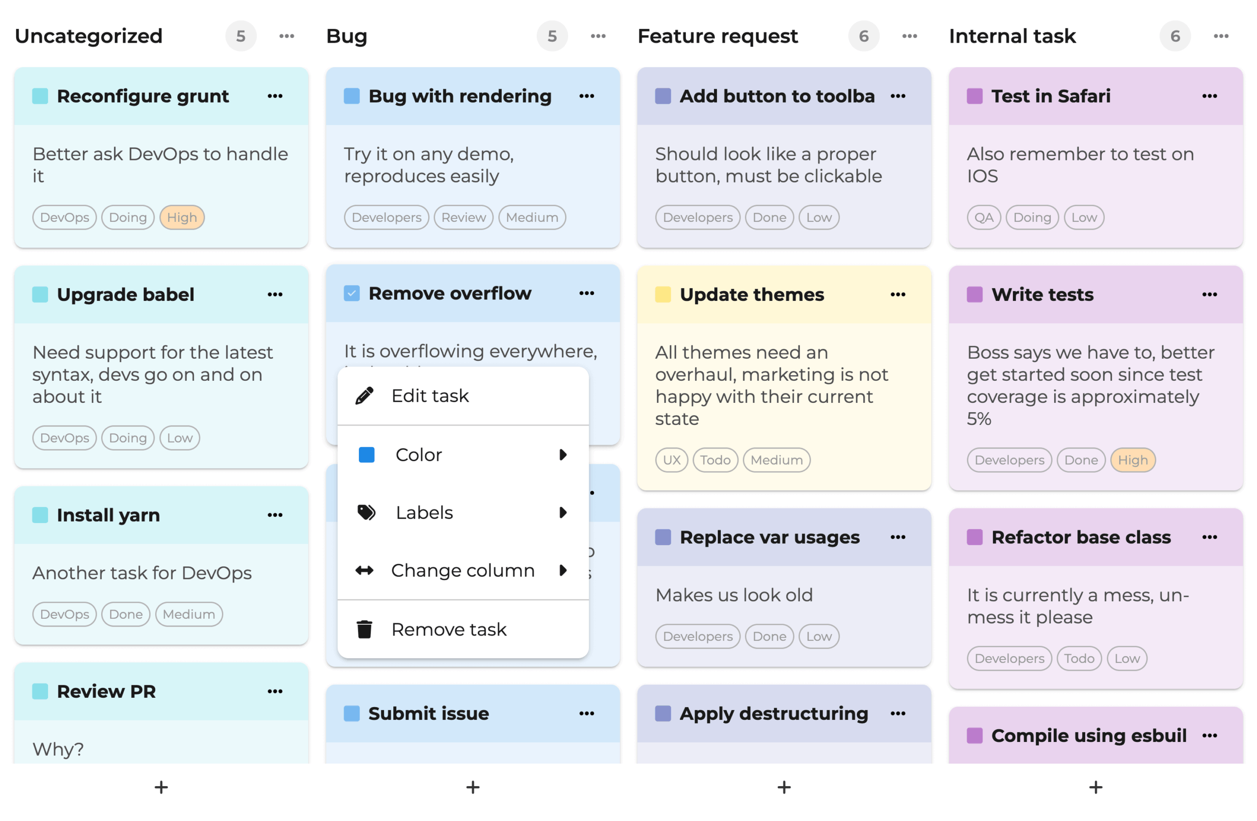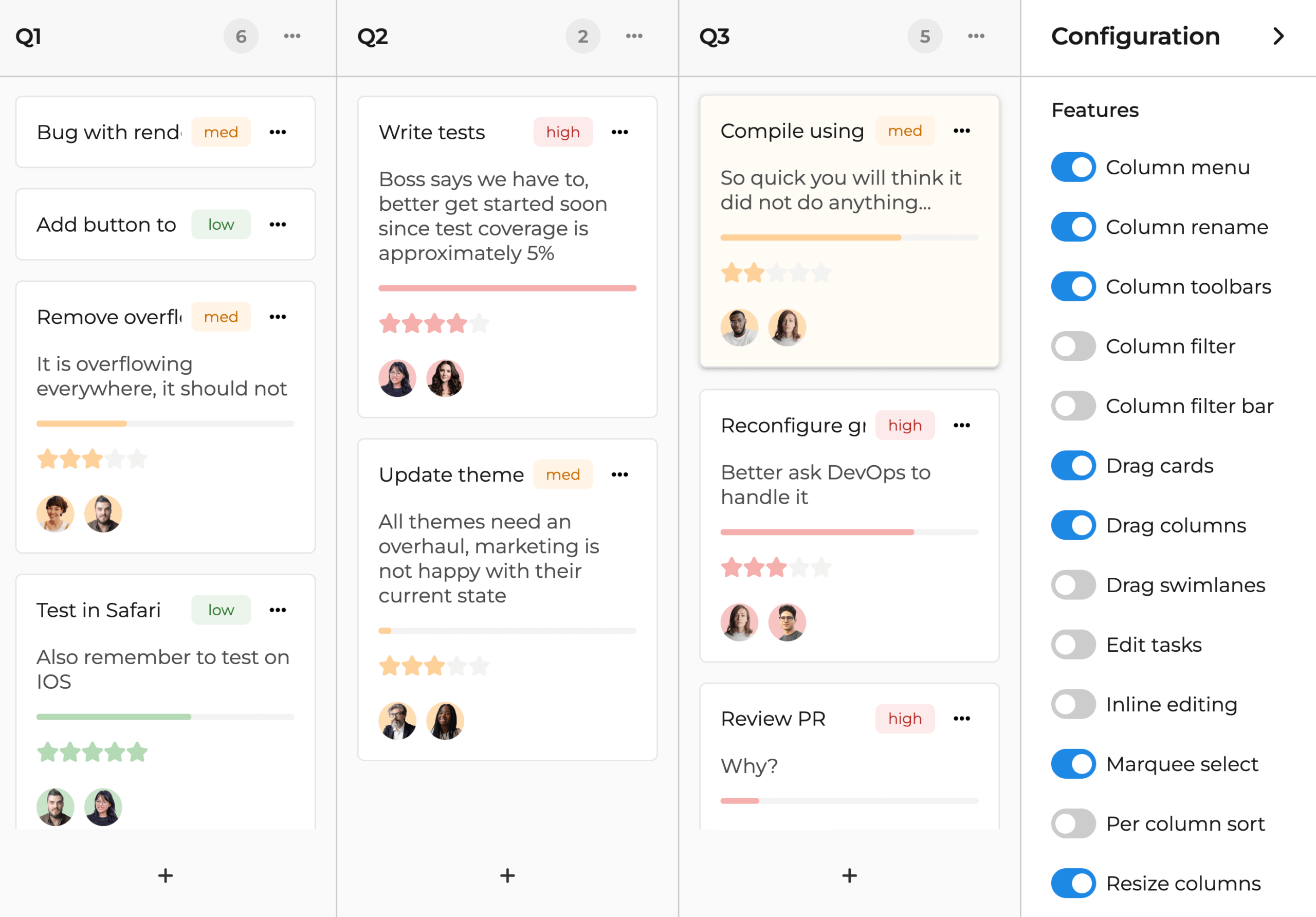 The Bryntum Task Board includes a set of optional features thoughtfully designed to fit your workflow: