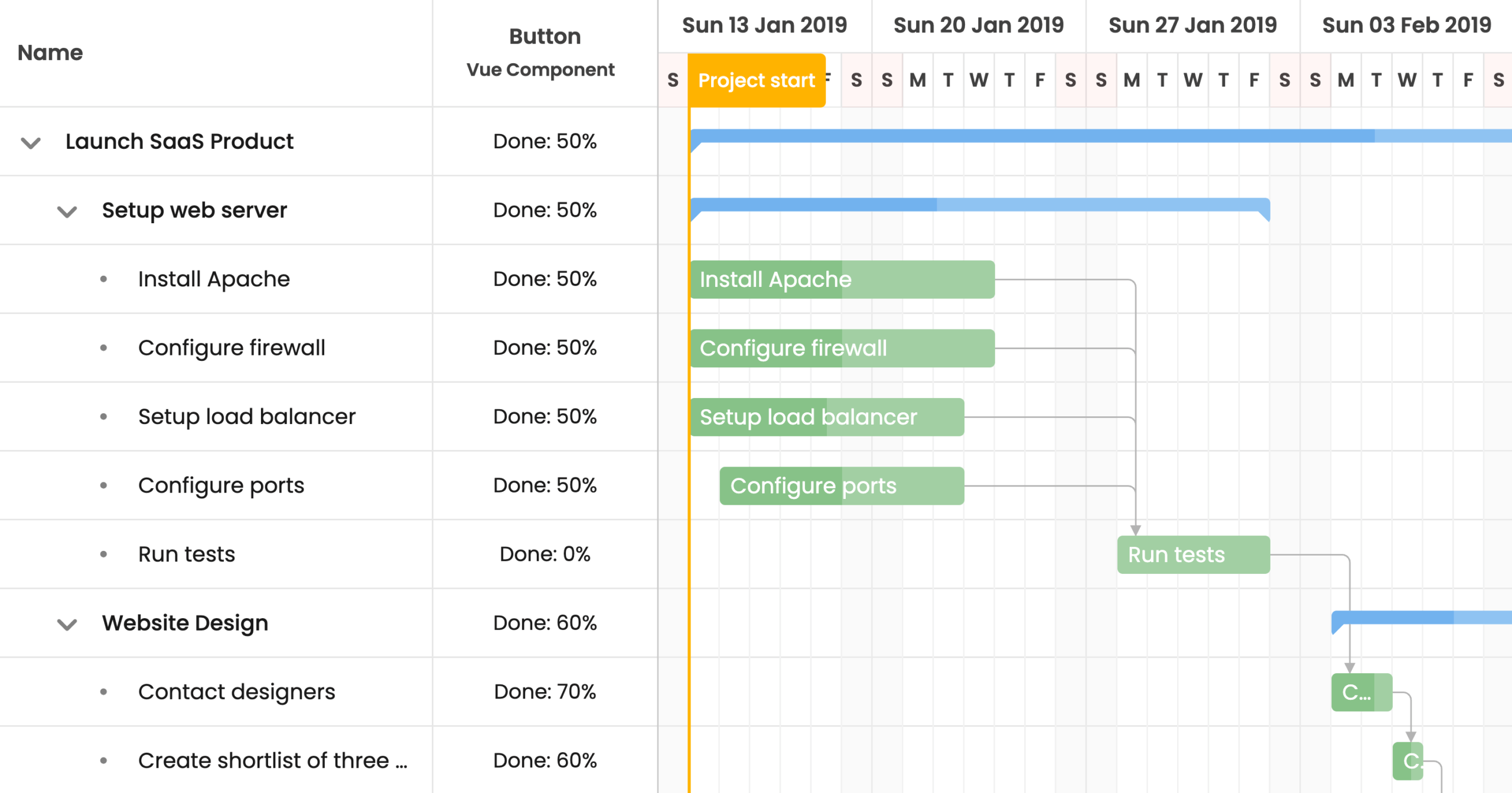 Use our Vue wrappers for advanced Gantt chart functionality using familiar Vue syntax.Â