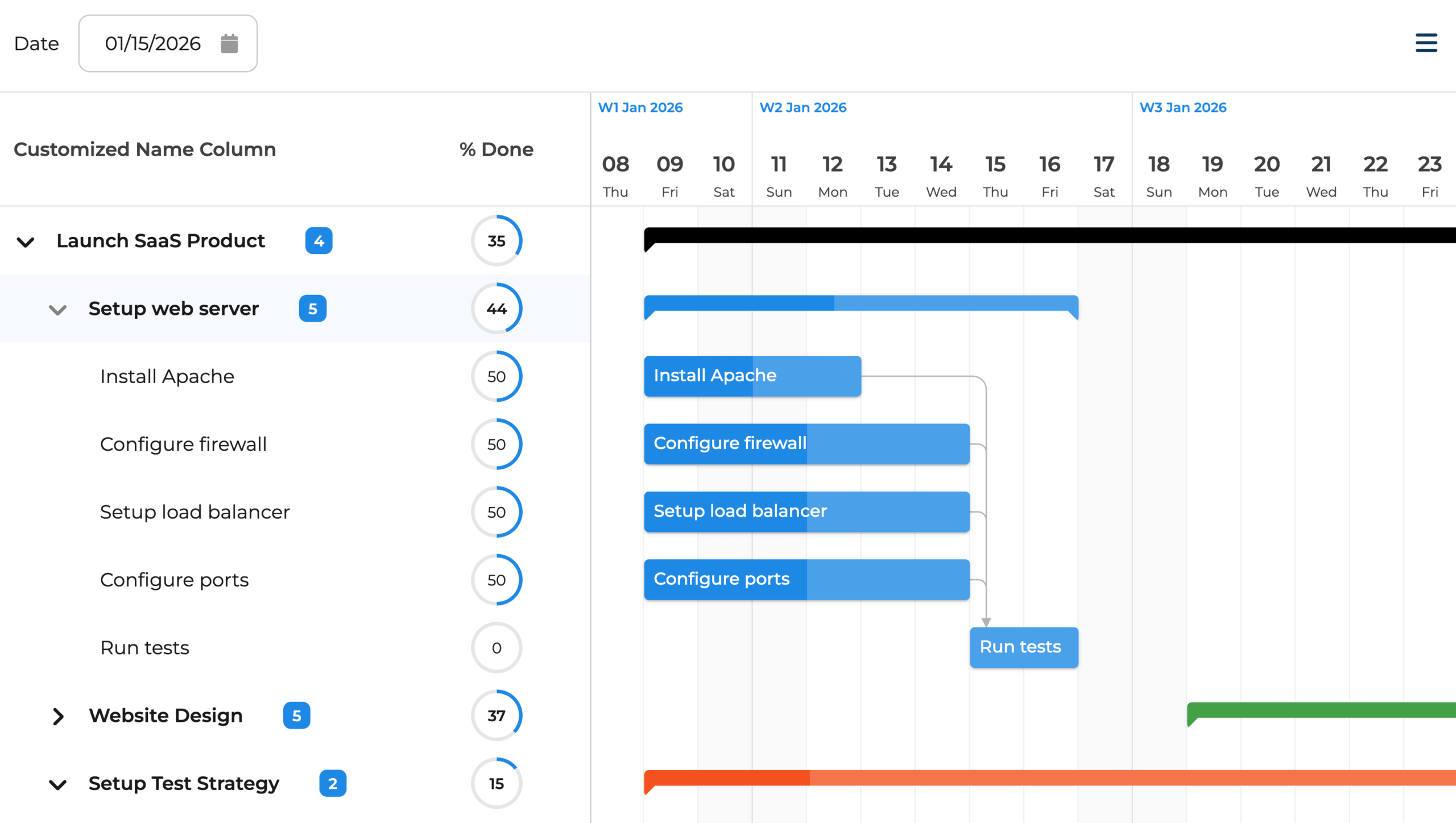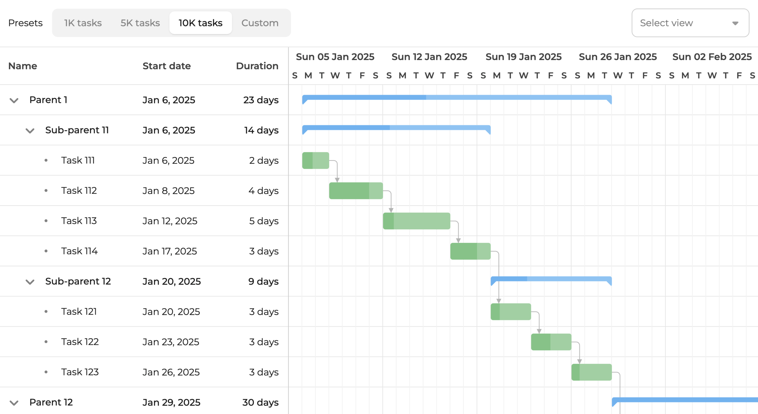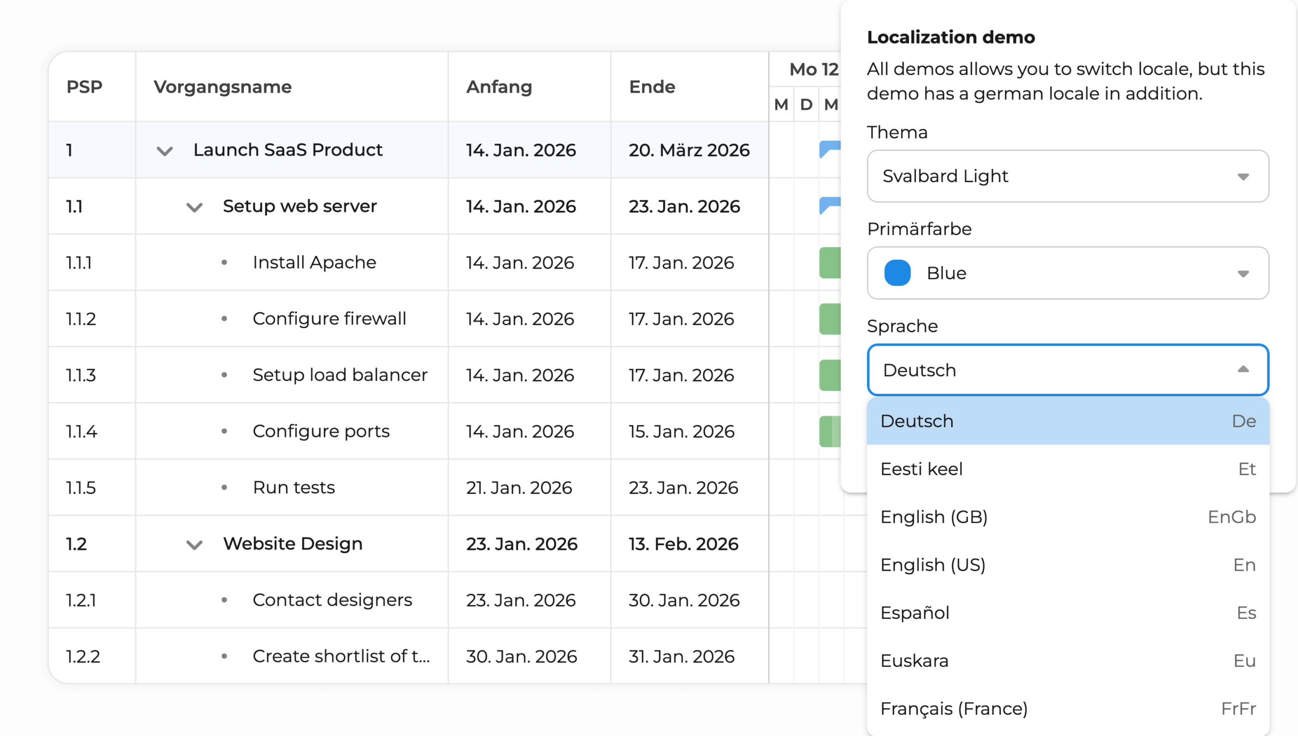 Bryntum Gantt delivers a modern, polished interface right out of the box. Built-in themes provide a premium look instantly, or customize the design to match your brand.