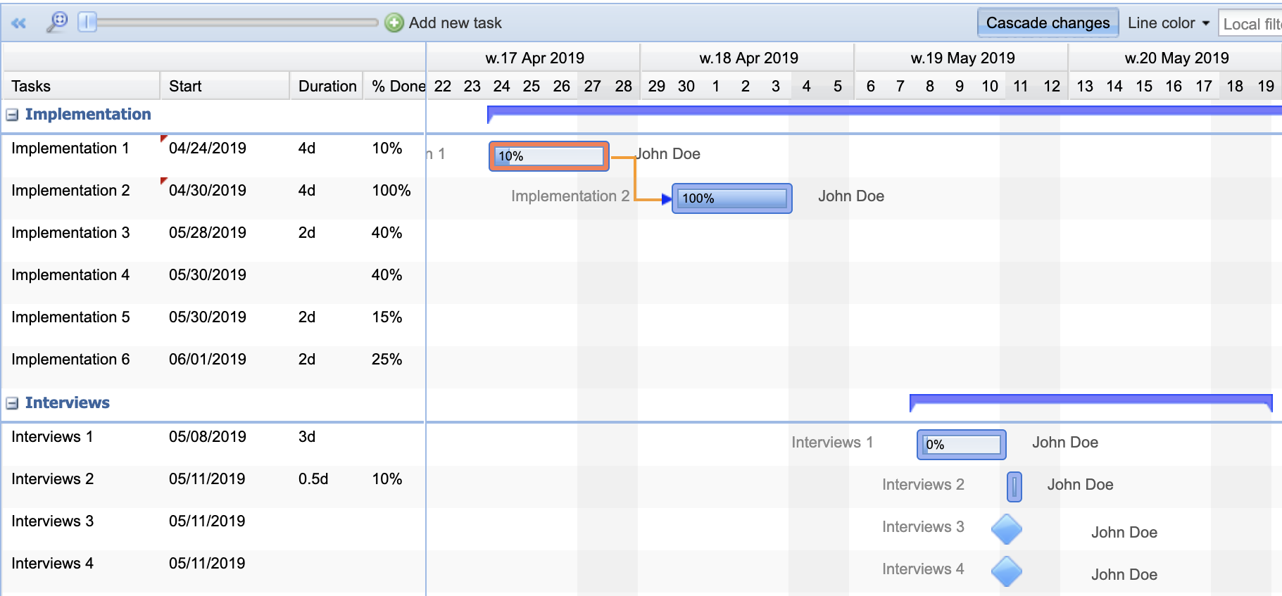 When you update a task, the Gantt engine will propagate the change and recompute all dependent tasks asynchronously and this results in a delta that the Gantt chart then animates (configurable).