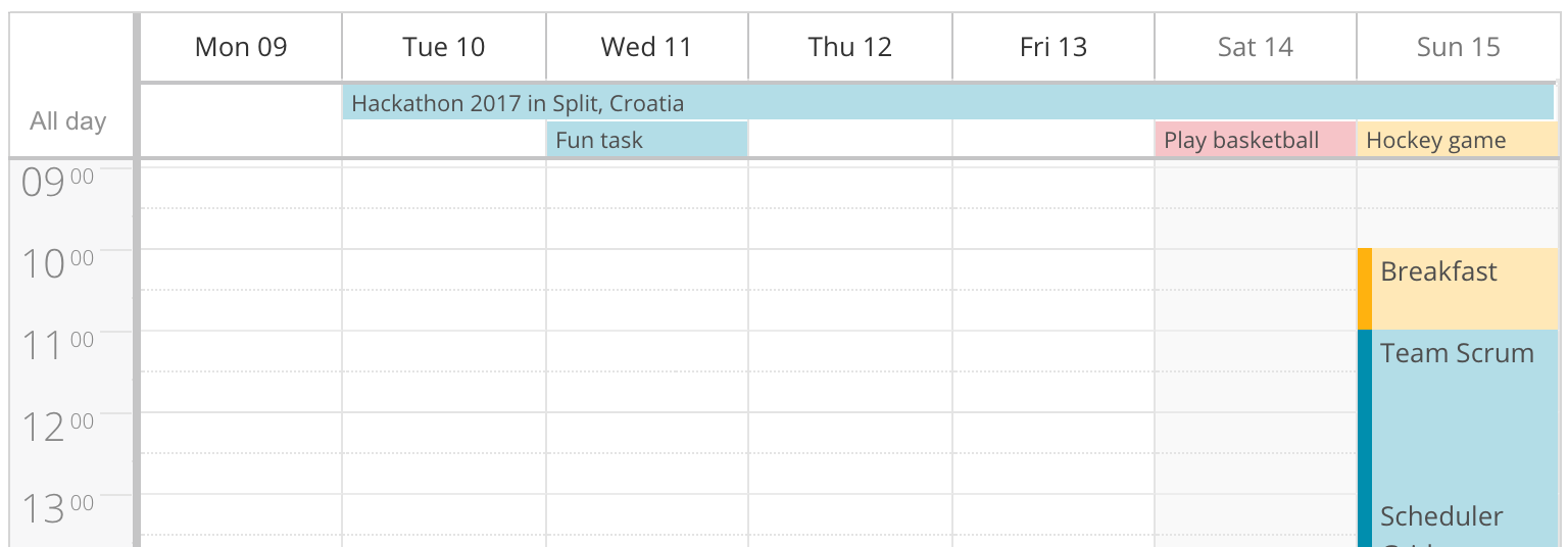 With the new all-day event header bar, you can now keep the main schedule area clean and not have multi-day events occupy all the space. This feature is now enabled by default in week view and day view modes.