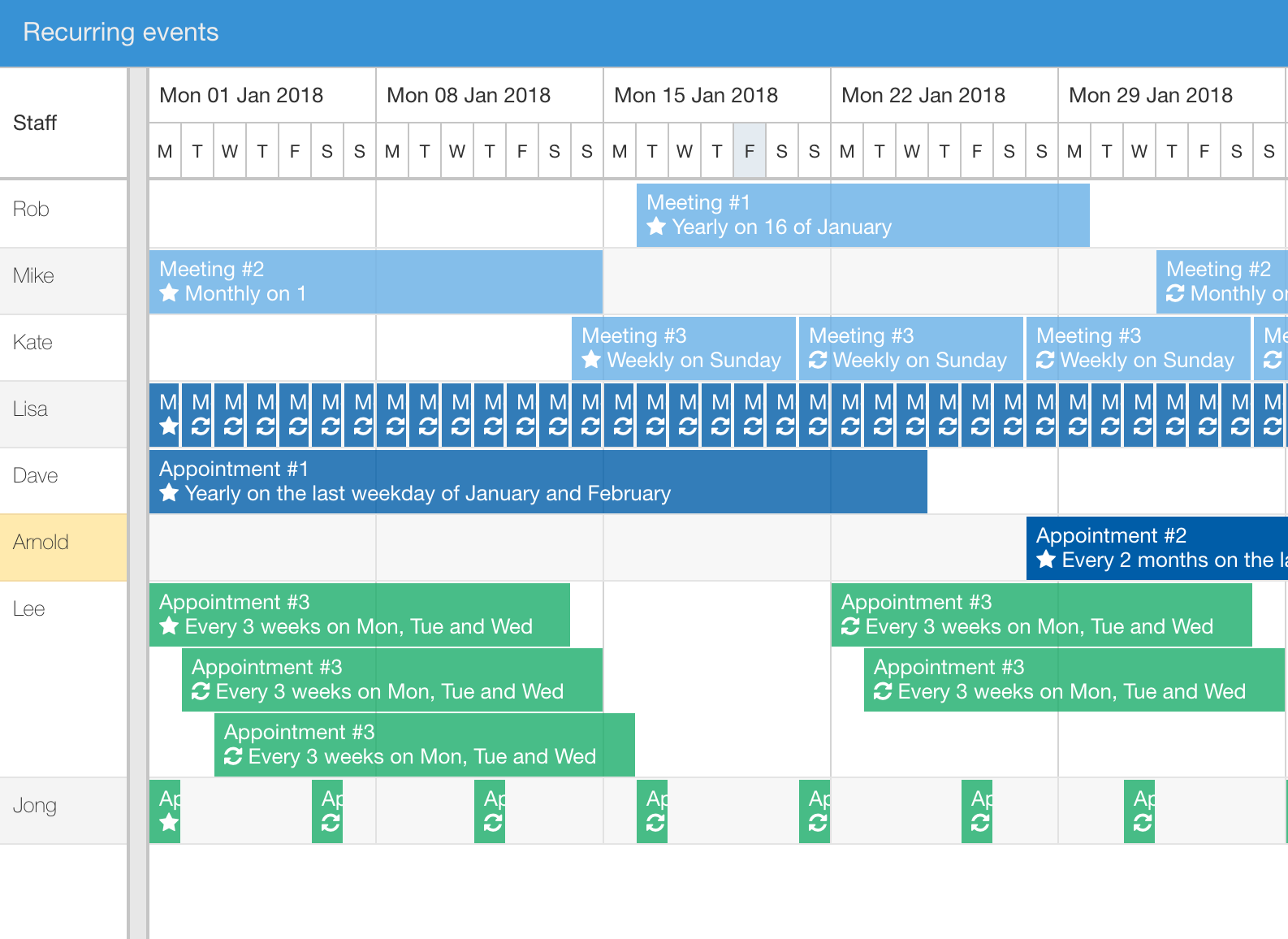 You have most likely used this feature already in other calendar software already, such as Google Calendar or Outlook. We are happy to announce that you can now schedule your tasks on a repeating basis in Ext Scheduler and use any type of recurrence pattern, demonstrated in this demo: