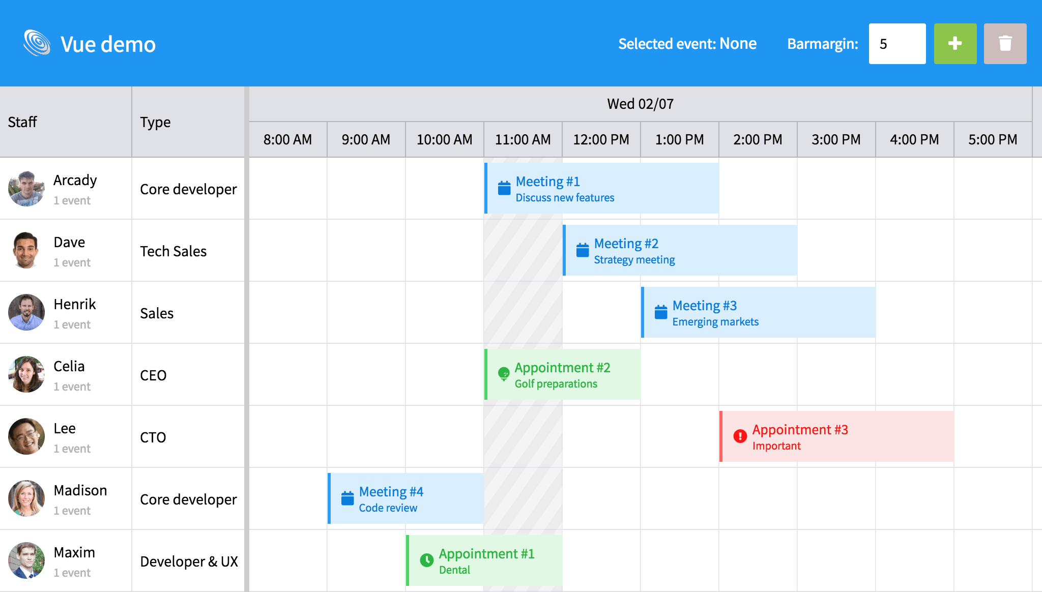 The Vue demo included with the Scheduler contains a Vue component called scheduler that uses the Scheduler as its engine. In this post we will outline the steps needed to add it to your project and also take a look at how to use it. To see the full demo in action, visit /products/scheduler/examples/vue.
