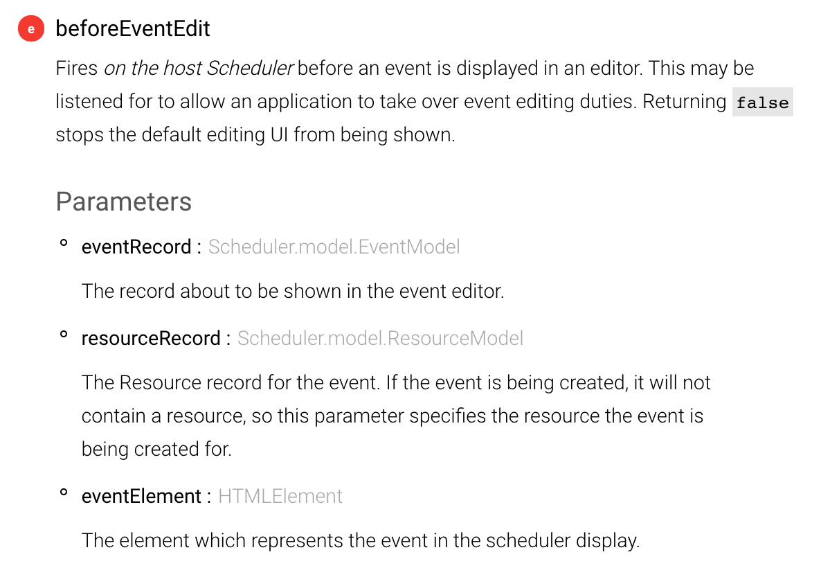 By default, the EventEdit feature is present in a Scheduler. It listens for editing gestures, ENTER on a focused event, or double tap on an event, or an invocation from the event context menu. It then provides its own editing UI to edit the properties of the event. In the example app, we listen for the beforeeventedit event which is fired before the default editing UI is shown. If we return false, then the default editing is vetoed, and we can use the application’s own UI to do this job. The event object signature is as follows: